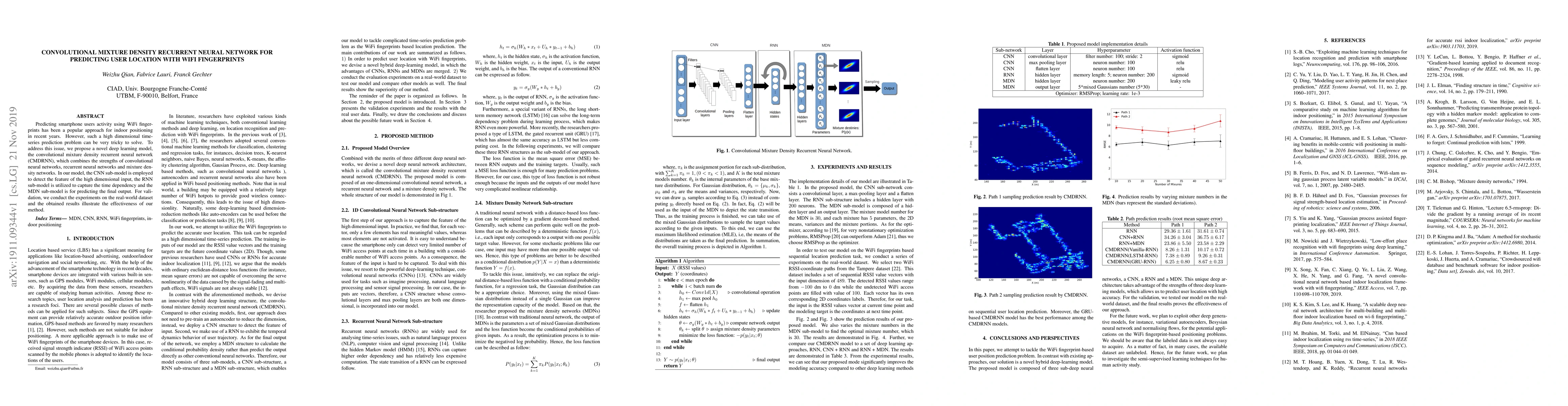 A new deep learning model called CMDRNN is proposed to predict user location based on WiFi fingerprints, combining strengths of CNNs, RNNs, and MDNs for effective time-series prediction.