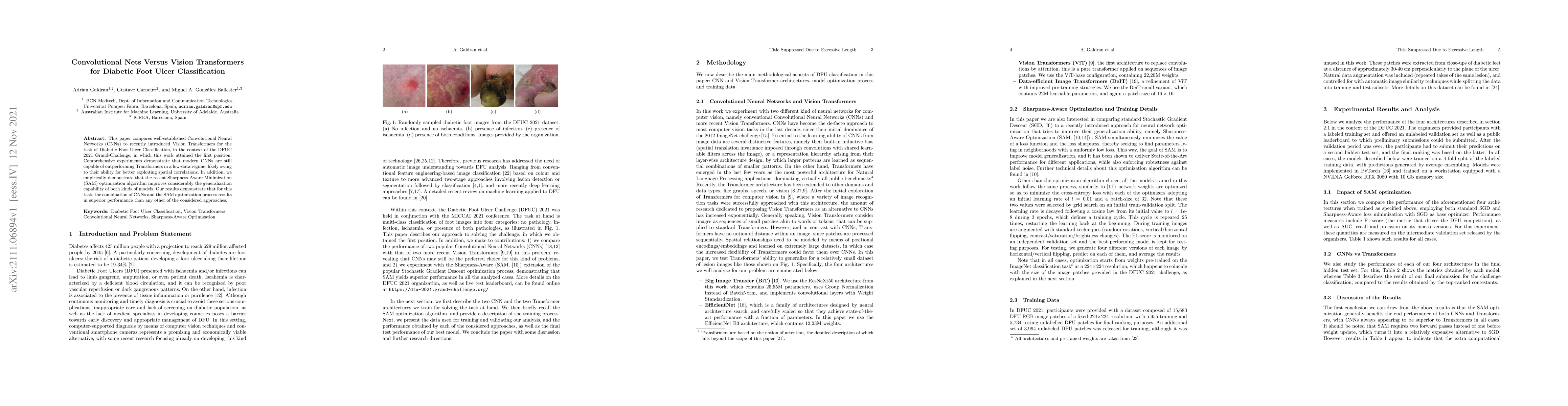 This paper compares well-established Convolutional Neural Networks (CNNs) to recently introduced Vision Transformers for the task of Diabetic Foot Ulcer Classification, in the context of the DFUC 2021 Grand-Challenge, in which this work attained the first position. Comprehensive experiments demonstrate that modern CNNs are still capable of outperforming Transformers in a low-data regime, likely owing to their ability for better exploiting spatial correlations. In addition, we empirically demonstrate that the recent Sharpness-Aware Minimization (SAM) optimization algorithm considerably improves the generalization capability of both kinds of models. Our results demonstrate that for this task, the combination of CNNs and the SAM optimization process results in superior performance than any other of the considered approaches.