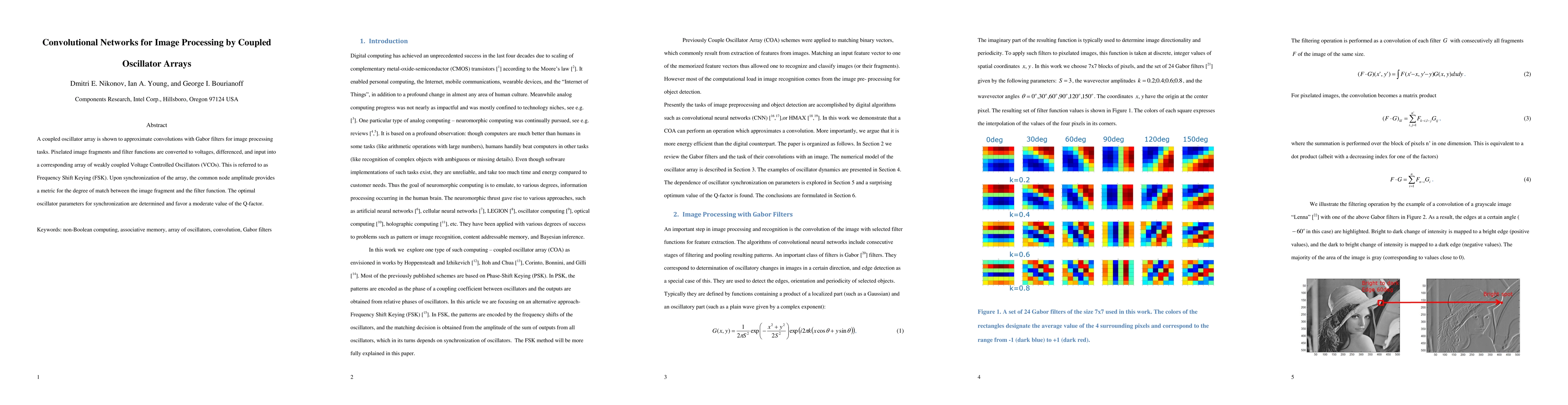 A coupled oscillator array is shown to approximate convolutions with Gabor filters for image processing tasks. Pixelated image fragments and filter functions are converted to voltages, differenced, and input into a corresponding array of weakly coupled Voltage Controlled Oscillators (VCOs). This is referred to as Frequency Shift Keying (FSK). Upon synchronization of the array, the common node amplitude provides a metric for the degree of match between the image fragment and the filter function. The optimal oscillator parameters for synchronization are determined and favor a moderate value of the Q-factor.