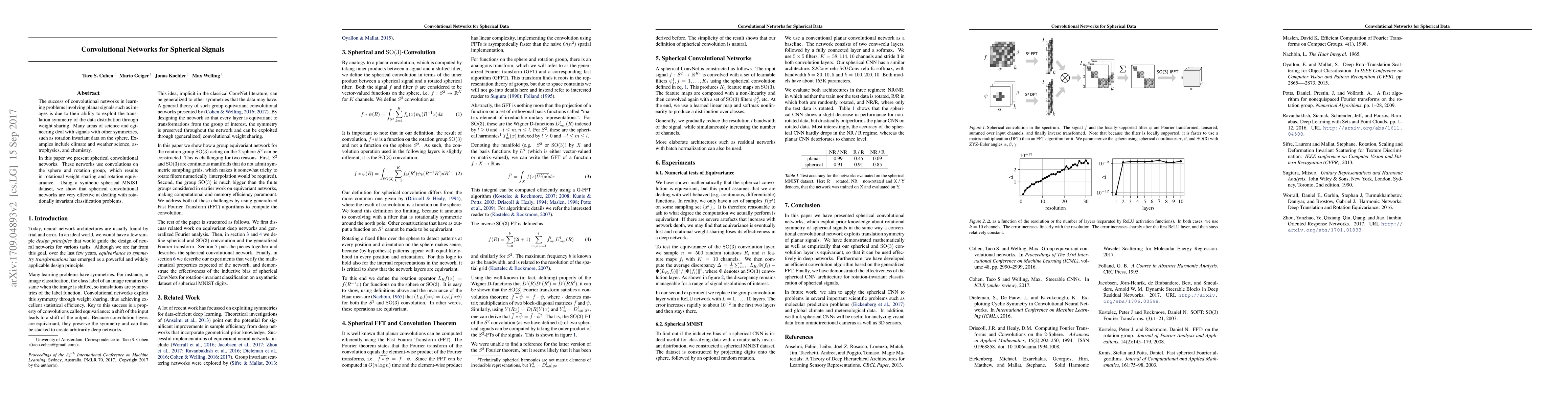 The paper presents spherical convolutional networks that exploit rotational symmetry of spherical signals, analogous to how conventional convolutional networks exploit translation symmetry in planar signals. These networks use convolutions on the sphere and the rotation group, leading to rotational weight sharing and rotation equivariance.