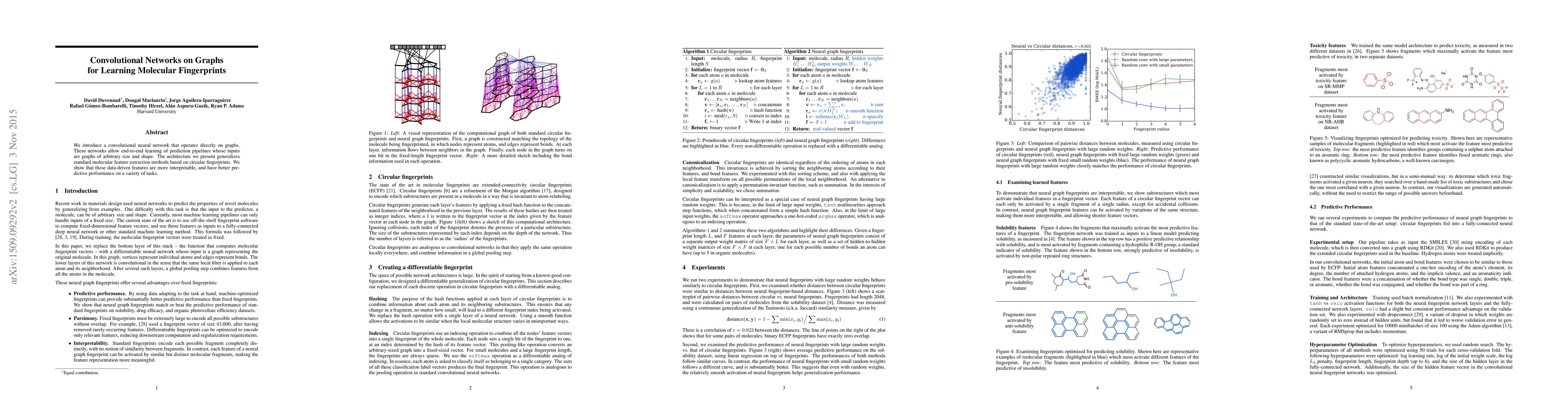 This paper proposes a convolutional neural network for learning molecular fingerprints directly from graph-structured data, achieving better interpretability and predictive performance compared to traditional methods. The introduced architecture enables end-to-end learning on graphs of any size and shape.