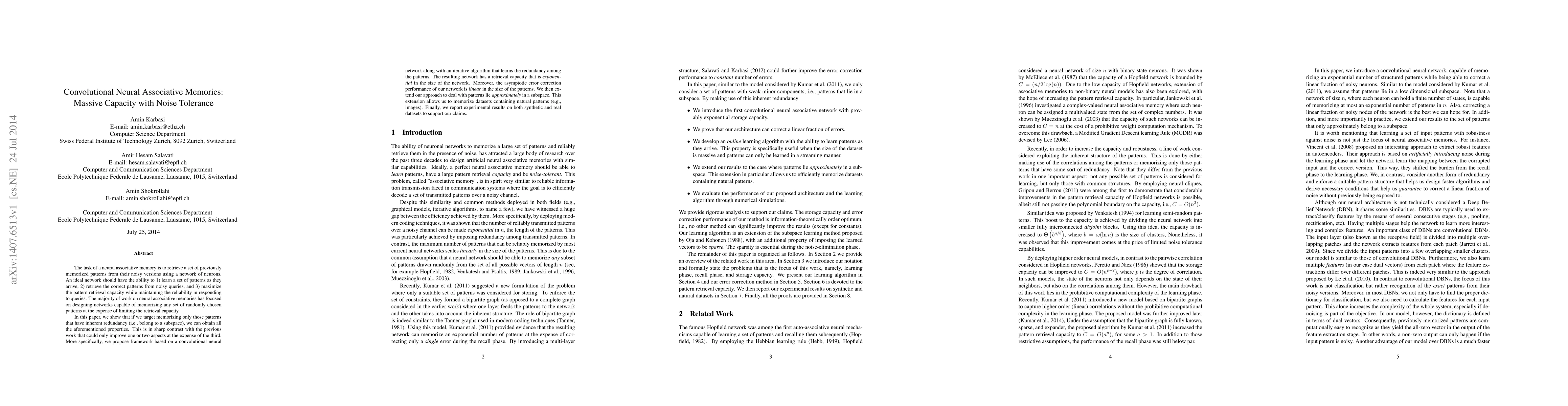 This paper proposes a convolutional neural network framework for associative memory that can learn and retrieve patterns from noisy inputs, leveraging inherent pattern redundancy to maximize retrieval capacity and noise tolerance. Experimental results demonstrate the network's exponential retrieval capacity and linear error correction performance.