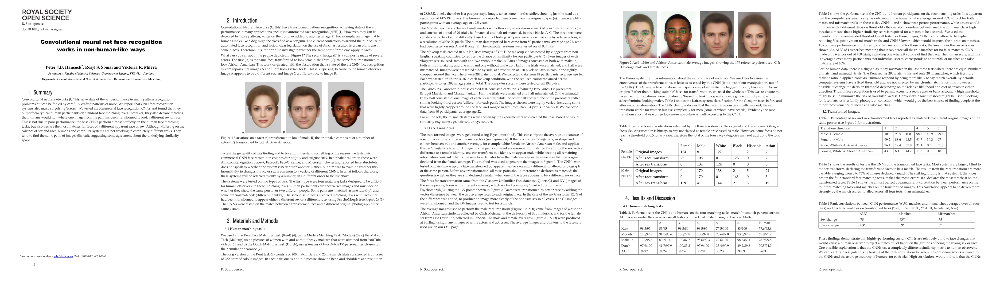 A study found that convolutional neural networks (CNNs) for face recognition made unexpected matches between images of different sexes or races, despite performing well on human matching tasks. Humans and CNNs share a common similarity space, suggesting that their errors may not be due to differences in perception but rather limitations in the algorithms themselves.