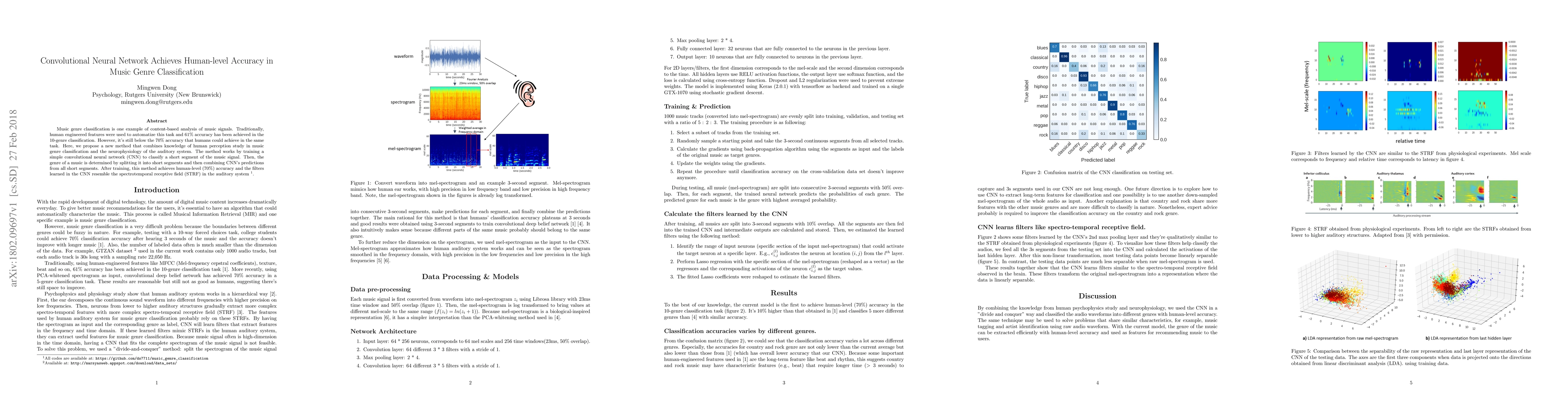 This paper proposes a convolutional neural network (CNN) that achieves human-level accuracy (70%) in music genre classification, surpassing traditional methods, by leveraging insights from human perception and neurophysiology. The CNN analyzes short music segments and combines its predictions to determine the overall genre.
