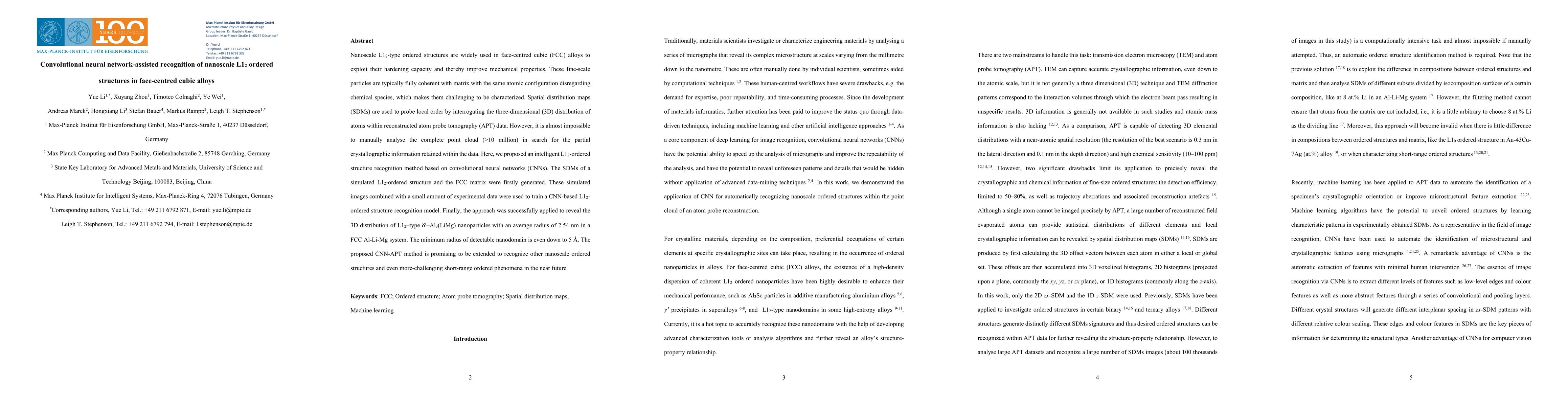This paper proposes a convolutional neural network (CNN)-assisted method to recognize nanoscale L12-ordered structures in face-centred cubic alloys using spatial distribution maps from atom probe tomography. The CNN model, trained on simulated and experimental data, successfully identifies L12-type $\delta^\prime$-Al3(LiMg) nanoparticles in an Al-Li-Mg system, demonstrating the potential for detecting nanodomains as small as 5 Å.