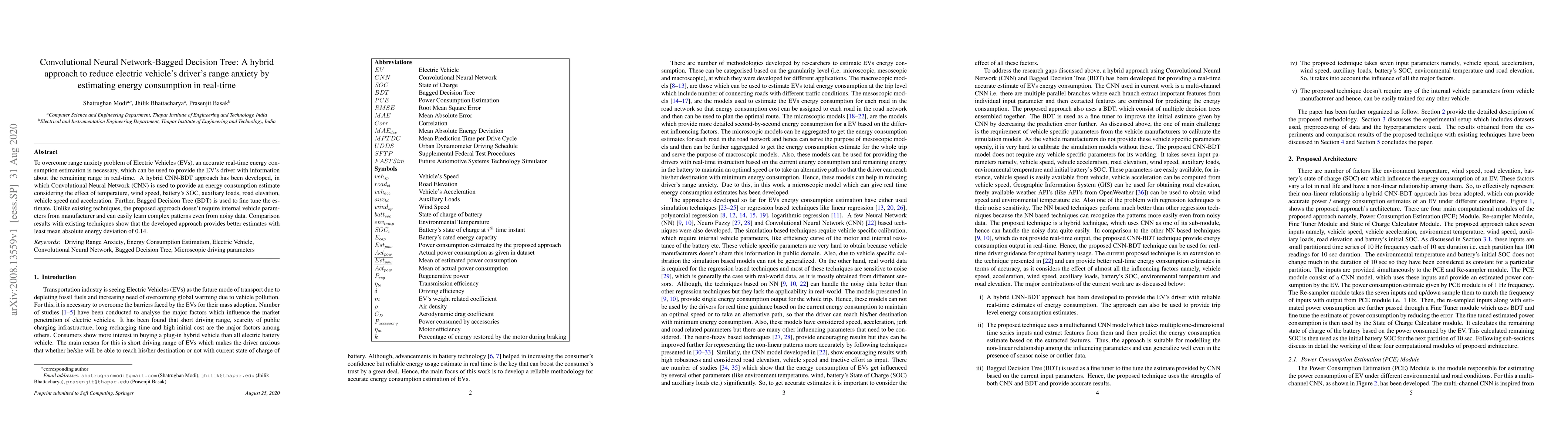 This paper proposes a hybrid Convolutional Neural Network-Bagged Decision Tree (CNN-BDT) approach to estimate real-time energy consumption in Electric Vehicles (EVs) to reduce driver's range anxiety. The CNN estimates consumption based on external factors, while the BDT fine-tunes the estimate, achieving a mean absolute energy deviation of 0.14, outperforming existing techniques.