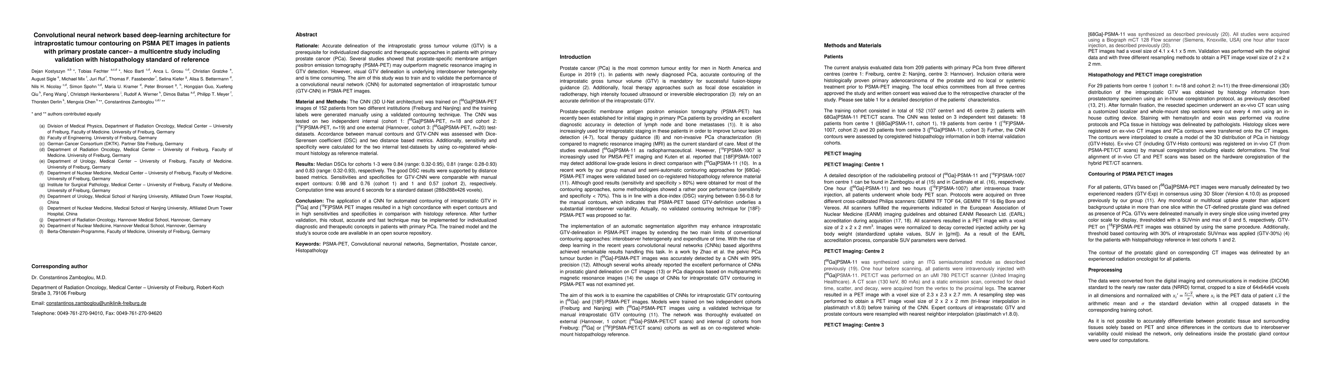 This study developed a convolutional neural network (CNN) for automated segmentation of intraprostatic tumour in PSMA-PET images, achieving high concordance with expert contours and comparable sensitivity and specificity to histology. The CNN-based method offers a robust, accurate, and fast alternative to manual delineation.