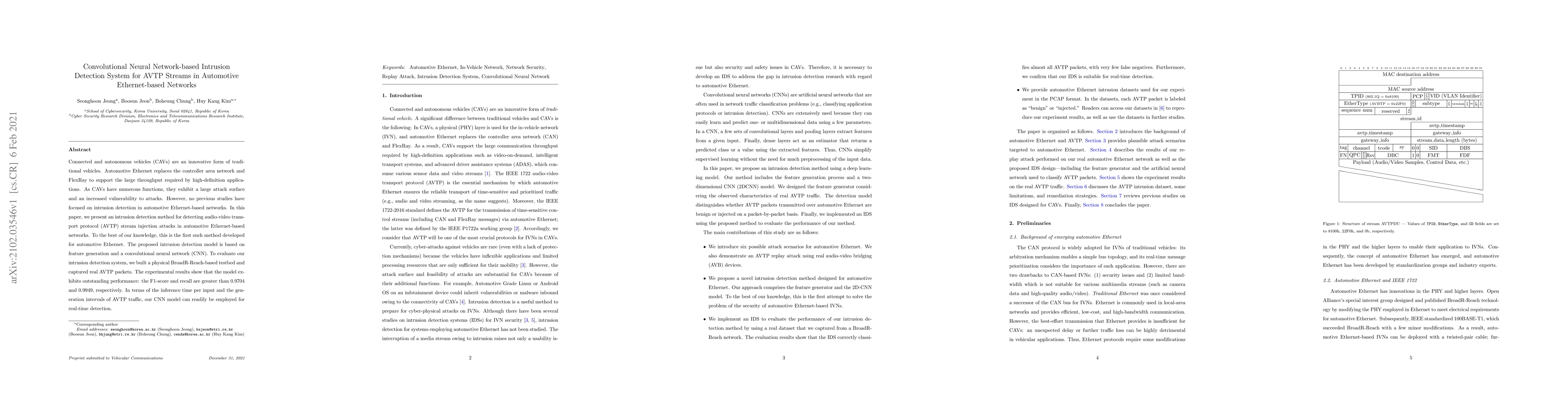 Connected and autonomous vehicles (CAVs) are an innovative form of traditional vehicles. Automotive Ethernet replaces the controller area network and FlexRay to support the large throughput required by high-definition applications. As CAVs have numerous functions, they exhibit a large attack surface and an increased vulnerability to attacks. However, no previous studies have focused on intrusion detection in automotive Ethernet-based networks. In this paper, we present an intrusion detection method for detecting audio-video transport protocol (AVTP) stream injection attacks in automotive Ethernet-based networks. To the best of our knowledge, this is the first such method developed for automotive Ethernet. The proposed intrusion detection model is based on feature generation and a convolutional neural network (CNN). To evaluate our intrusion detection system, we built a physical BroadR-Reach-based testbed and captured real AVTP packets. The experimental results show that the model exhibits outstanding performance: the F1-score and recall are greater than 0.9704 and 0.9949, respectively. In terms of the inference time per input and the generation intervals of AVTP traffic, our CNN model can readily be employed for real-time detection.