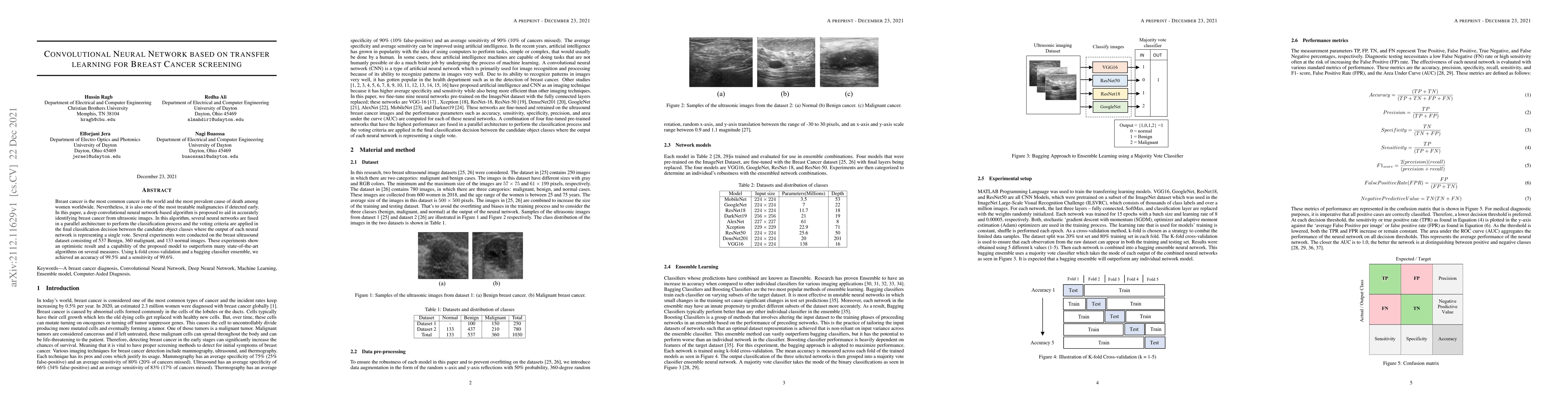 This research proposes a convolutional neural network using transfer learning to identify breast cancer from ultrasonic images with high accuracy, achieving 99.5% accuracy and 99.6% sensitivity through ensemble methods on a dataset of 1,030 images. The method outperforms many existing algorithms in early breast cancer detection.