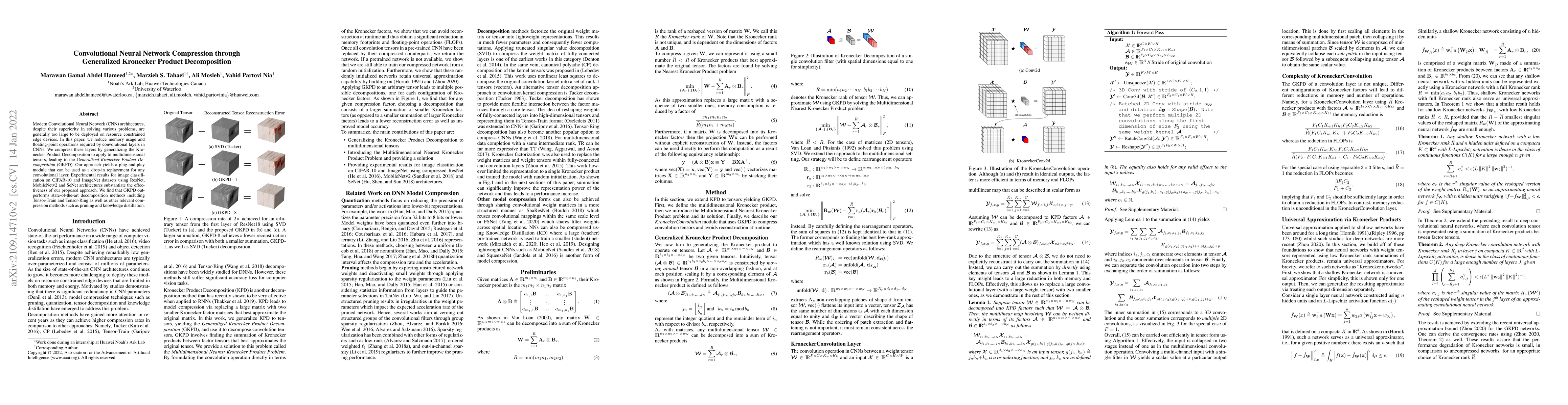 This paper proposes a Generalized Kronecker Product Decomposition (GKPD) to compress convolutional layers in CNNs, reducing memory and computational requirements. Experimental results show GKPD outperforms other compression methods on image classification tasks, making it a viable solution for resource-constrained edge devices.