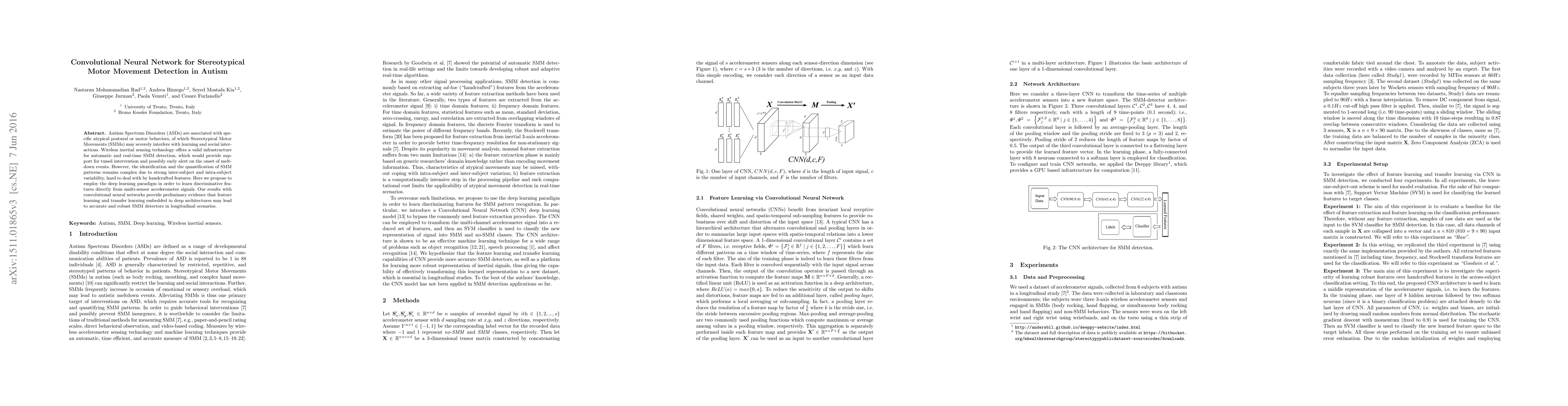 This paper proposes a Convolutional Neural Network (CNN) to detect Stereotypical Motor Movements (SMMs) in autism using accelerometer data, aiming to automate the identification process and support therapy interventions. The study demonstrates that deep learning methods outperform handcrafted features in handling inter-subject and intra-subject variability, showing promising results for real-time SMM detection.