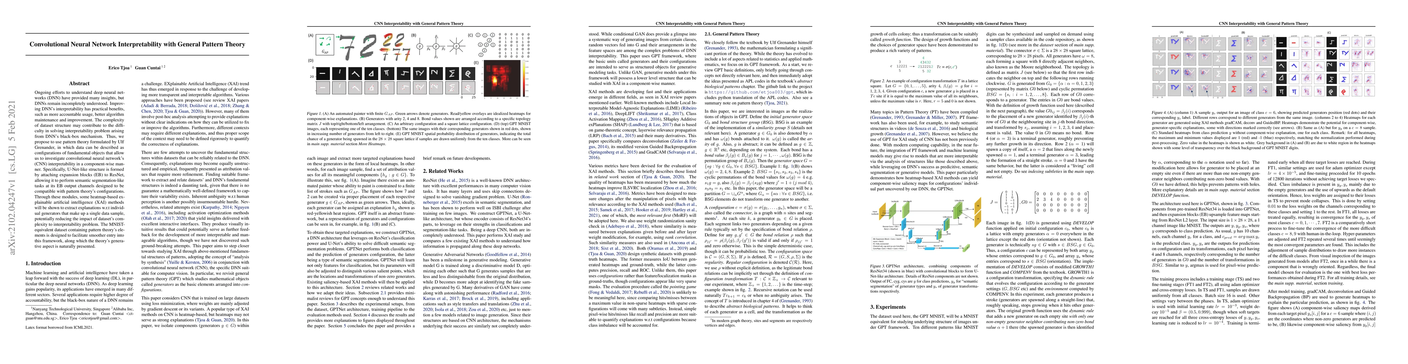Ongoing efforts to understand deep neural networks (DNN) have provided many insights, but DNNs remain incompletely understood. Improving DNN's interpretability has practical benefits, such as more accountable usage, better algorithm maintenance and improvement. The complexity of dataset structure may contribute to the difficulty in solving interpretability problem arising from DNN's black-box mechanism. Thus, we propose to use pattern theory formulated by Ulf Grenander, in which data can be described as configurations of fundamental objects that allow us to investigate convolutional neural network's (CNN) interpretability in a component-wise manner. Specifically, U-Net-like structure is formed by attaching expansion blocks (EB) to ResNet, allowing it to perform semantic segmentation-like tasks at its EB output channels designed to be compatible with pattern theory's configurations. Through these modules, some heatmap-based explainable artificial intelligence (XAI) methods will be shown to extract explanations w.r.t individual generators that make up a single data sample, potentially reducing the impact of dataset's complexity to interpretability problem. The MNIST-equivalent dataset containing pattern theory's elements is designed to facilitate smoother entry into this framework, along which the theory's generative aspect is naturally presented.