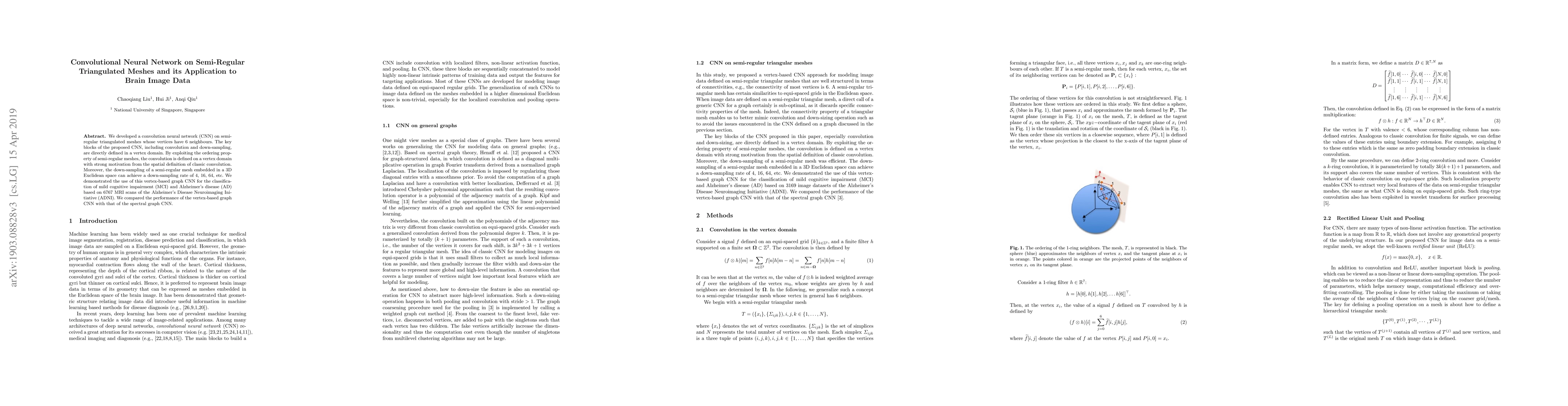 We developed a convolution neural network (CNN) on semi-regular triangulated meshes whose vertices have 6 neighbours. The key blocks of the proposed CNN, including convolution and down-sampling, are directly defined in a vertex domain. By exploiting the ordering property of semi-regular meshes, the convolution is defined on a vertex domain with strong motivation from the spatial definition of classic convolution. Moreover, the down-sampling of a semi-regular mesh embedded in a 3D Euclidean space can achieve a down-sampling rate of 4, 16, 64, etc. We demonstrated the use of this vertex-based graph CNN for the classification of mild cognitive impairment (MCI) and Alzheimer's disease (AD) based on 3169 MRI scans of the Alzheimer's Disease Neuroimaging Initiative (ADNI). We compared the performance of the vertex-based graph CNN with that of the spectral graph CNN.