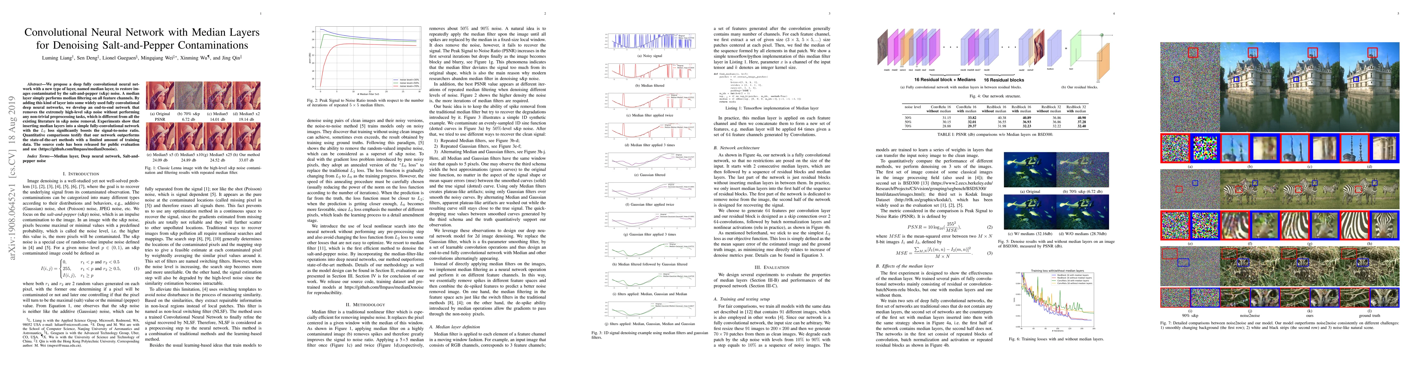This paper introduces a convolutional neural network with median layers to effectively remove salt-and-pepper noise from images. The median layers perform median filtering on feature channels, enhancing the network's ability to denoise without complex preprocessing.