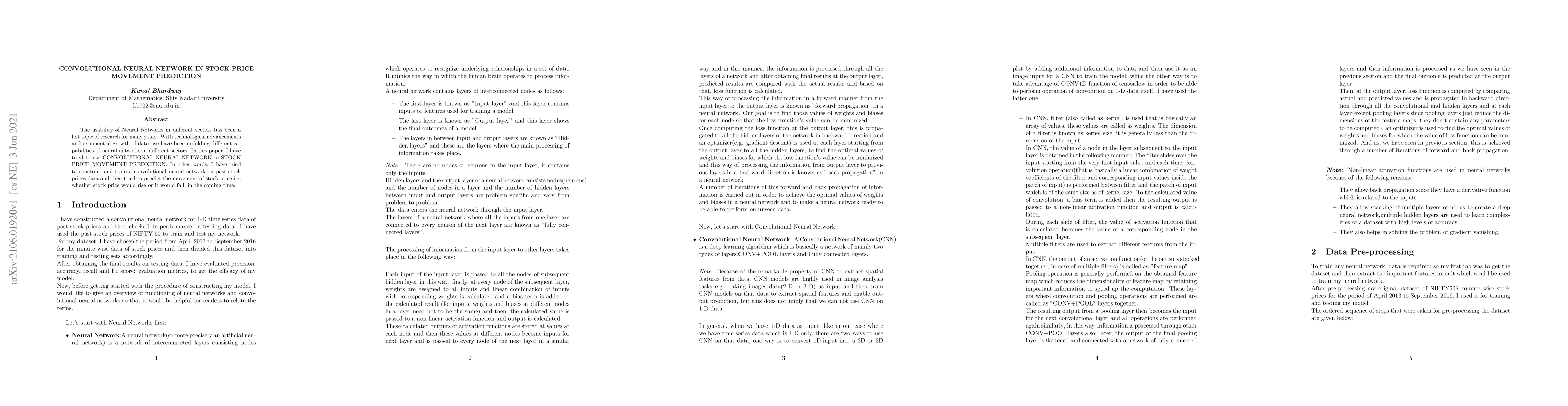 This paper explores the use of Convolutional Neural Networks (CNN/ConvNet) to predict stock price movements by training the network on historical stock price data to forecast whether prices will rise or fall. The study demonstrates the potential of neural networks in financial market predictions.