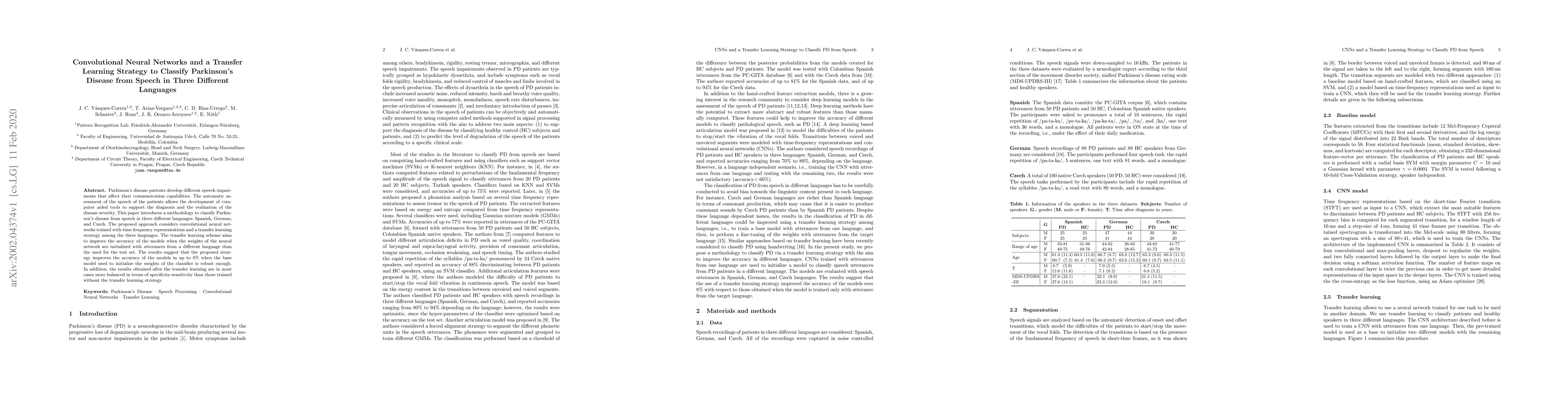 This paper proposes a convolutional neural network (CNN) approach with transfer learning to classify Parkinson's disease from speech in Spanish, German, and Czech. The transfer learning strategy enhances model accuracy by up to 8% and improves the balance between specificity and sensitivity compared to models without it.