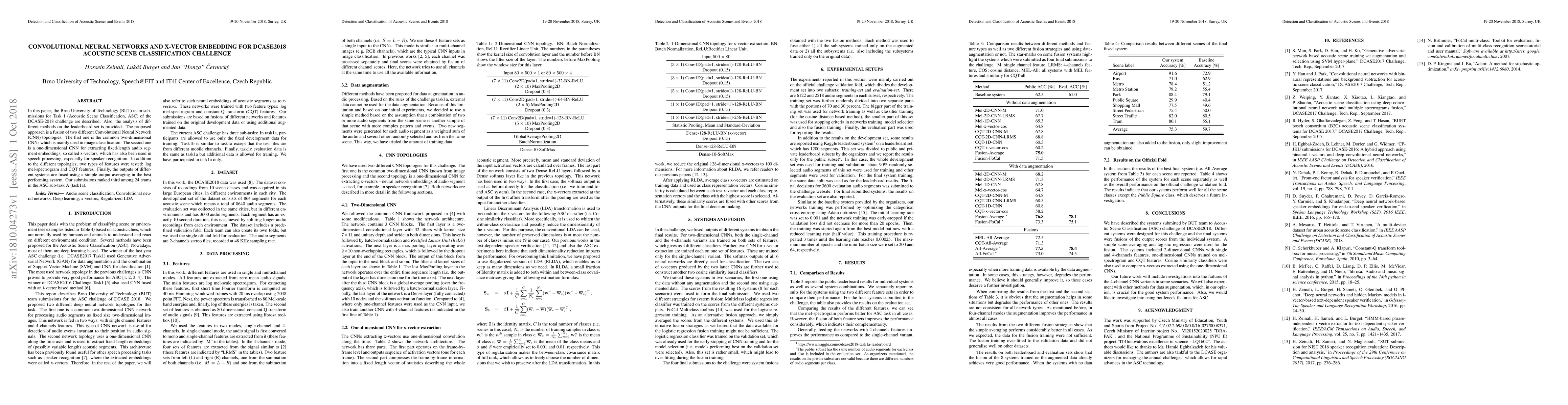 The Brno University of Technology team combined two Convolutional Neural Networks (CNN) topologies for DCASE2018's Acoustic Scene Classification, achieving third place among 24 teams. The approach fused two-dimensional CNNs for image classification and one-dimensional CNNs for x-vector embeddings, testing log mel-spectrogram and CQT features, with outputs averaged for optimal performance.