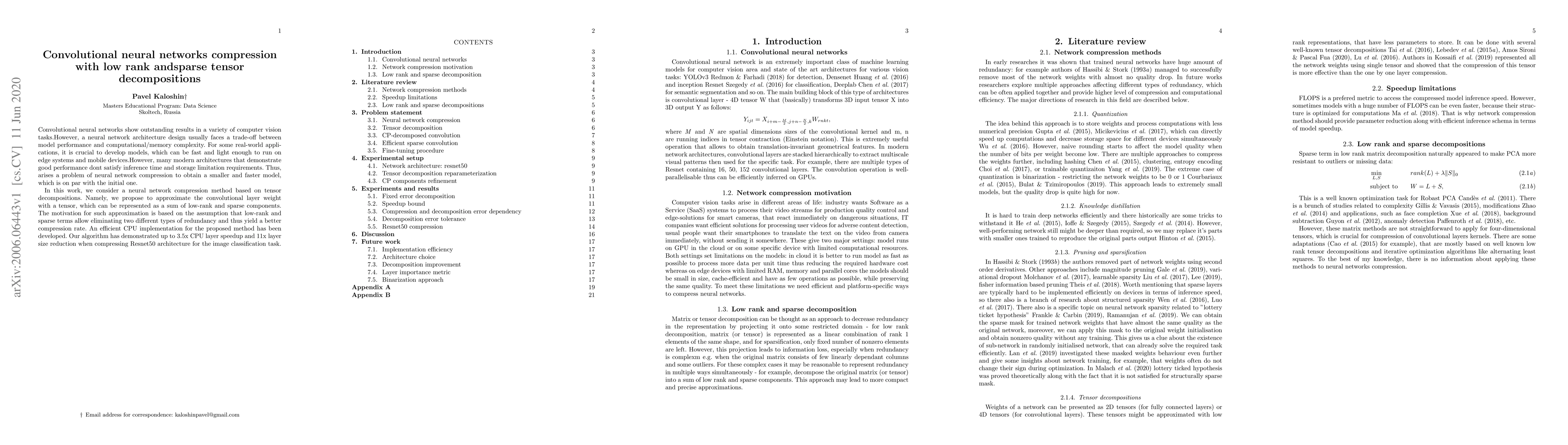 This paper proposes a neural network compression method using low-rank and sparse tensor decompositions to reduce the size and speed of convolutional neural networks. The method achieves up to 3.5x speedup and 11x size reduction in Resnet50 for image classification, addressing the trade-off between performance and computational complexity.