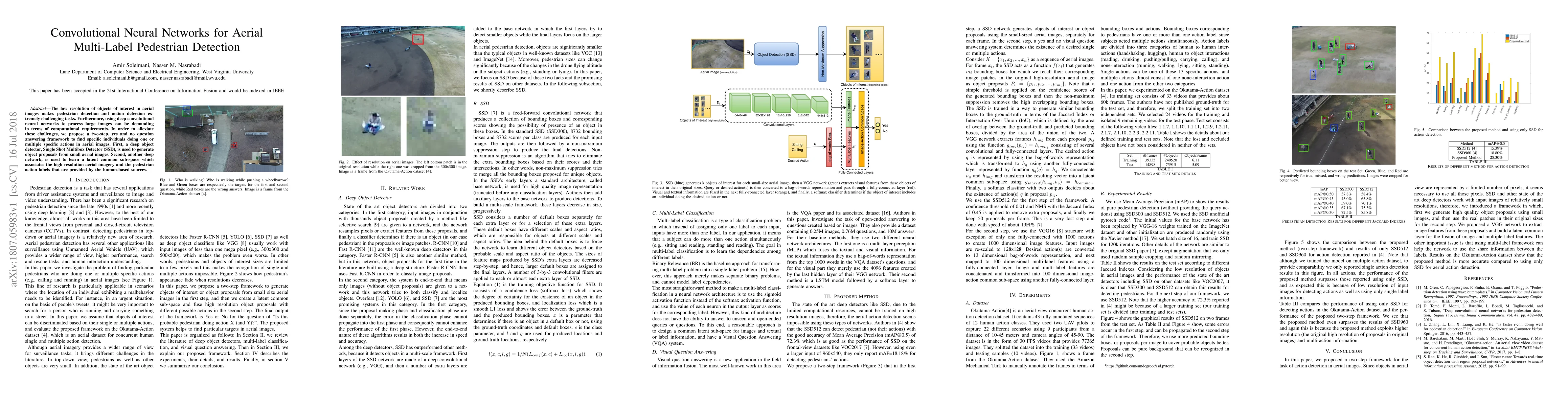 This paper proposes a two-step framework using deep convolutional neural networks for detecting and classifying pedestrians in low-resolution aerial images. It employs an SSD for initial object detection followed by a network learning a common sub-space for associating high-resolution imagery with pedestrian actions.
