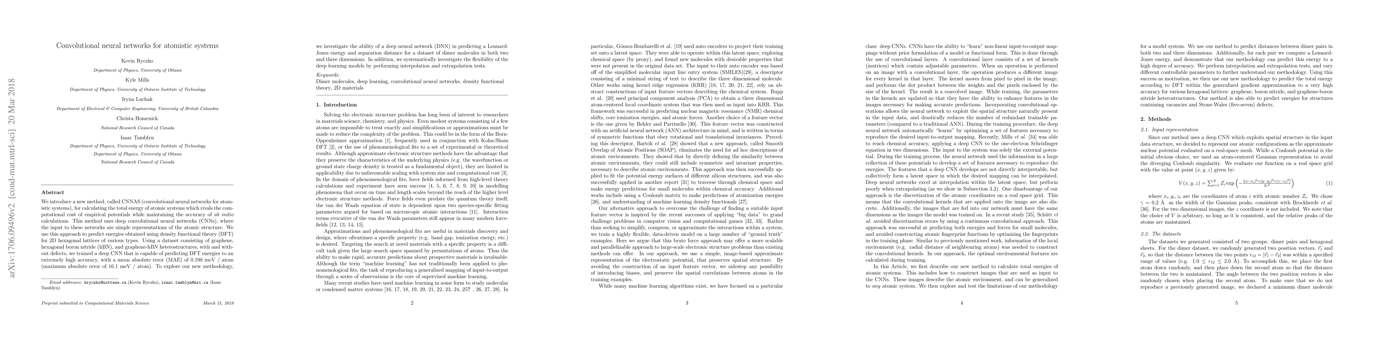We introduce a new method, called CNNAS (convolutional neural networks for atomistic systems), for calculating the total energy of atomic systems which rivals the computational cost of empirical potentials while maintaining the accuracy of \emph{ab initio} calculations. This method uses deep convolutional neural networks (CNNs), where the input to these networks are simple representations of the atomic structure. We use this approach to predict energies obtained using density functional theory (DFT) for 2D hexagonal lattices of various types. Using a dataset consisting of graphene, hexagonal boron nitride (hBN), and graphene-hBN heterostructures, with and without defects, we trained a deep CNN that is capable of predicting DFT energies to an extremely high accuracy, with a mean absolute error (MAE) of 0.198 meV / atom (maximum absolute error of 16.1 meV / atom). To explore our new methodology, we investigate the ability of a deep neural network (DNN) in predicting a Lennard-Jones energy and separation distance for a dataset of dimer molecules in both two and three dimensions. In addition, we systematically investigate the flexibility of the deep learning models by performing interpolation and extrapolation tests.