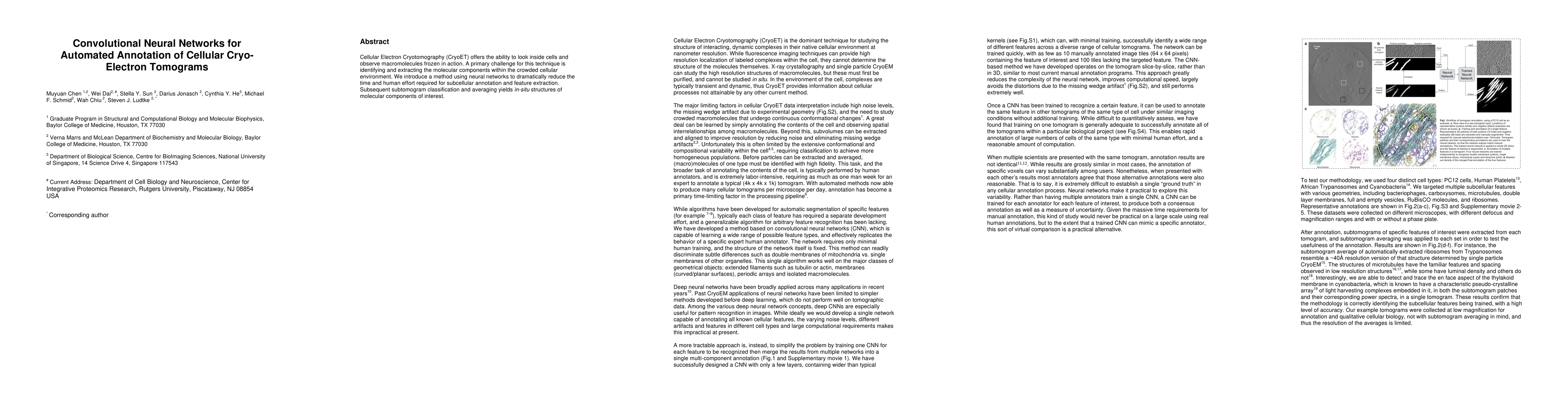 Cellular Electron Cryotomography (CryoET) offers the ability to look inside cells and observe macromolecules frozen in action. A primary challenge for this technique is identifying and extracting the molecular components within the crowded cellular environment. We introduce a method using neural networks to dramatically reduce the time and human effort required for subcellular annotation and feature extraction. Subsequent subtomogram classification and averaging yields in-situ structures of molecular components of interest.