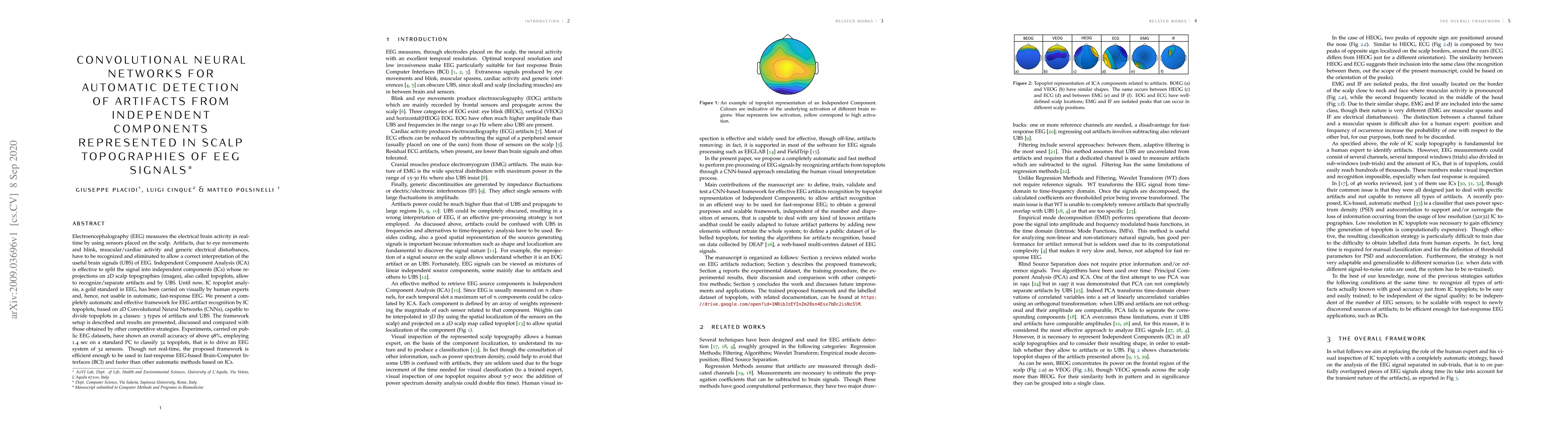 This paper proposes an automatic framework using Convolutional Neural Networks (CNNs) to detect artifacts in EEG signals represented by Independent Component Analysis (ICA) topoplots. The method achieves over 98% accuracy in classifying four classes: three types of artifacts and useful brain signals, and is efficient enough for use in fast-response EEG-based Brain-Computer Interfaces.
