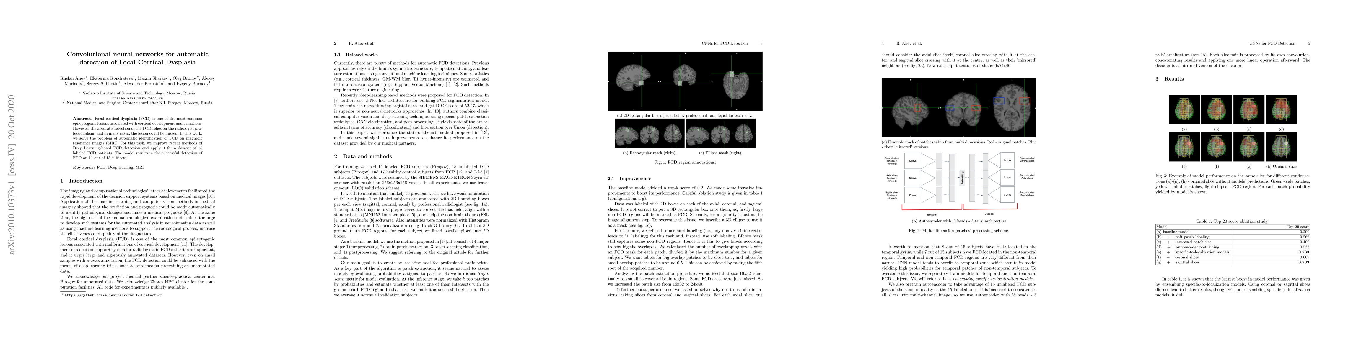 Focal cortical dysplasia (FCD) is one of the most common epileptogenic lesions associated with cortical development malformations. However, the accurate detection of the FCD relies on the radiologist professionalism, and in many cases, the lesion could be missed. In this work, we solve the problem of automatic identification of FCD on magnetic resonance images (MRI). For this task, we improve recent methods of Deep Learning-based FCD detection and apply it for a dataset of 15 labeled FCD patients. The model results in the successful detection of FCD on 11 out of 15 subjects.