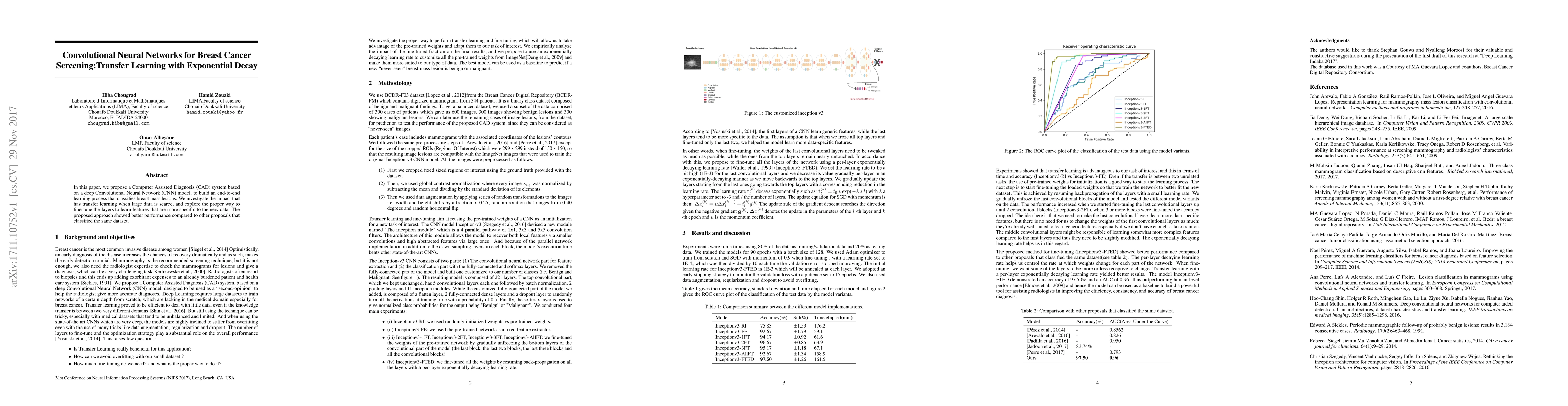 This paper proposes a CAD system using a CNN model for classifying breast mass lesions, leveraging transfer learning to improve performance when large datasets are unavailable. The method fine-tunes layers effectively, demonstrating superior results compared to other classification methods on the same dataset.