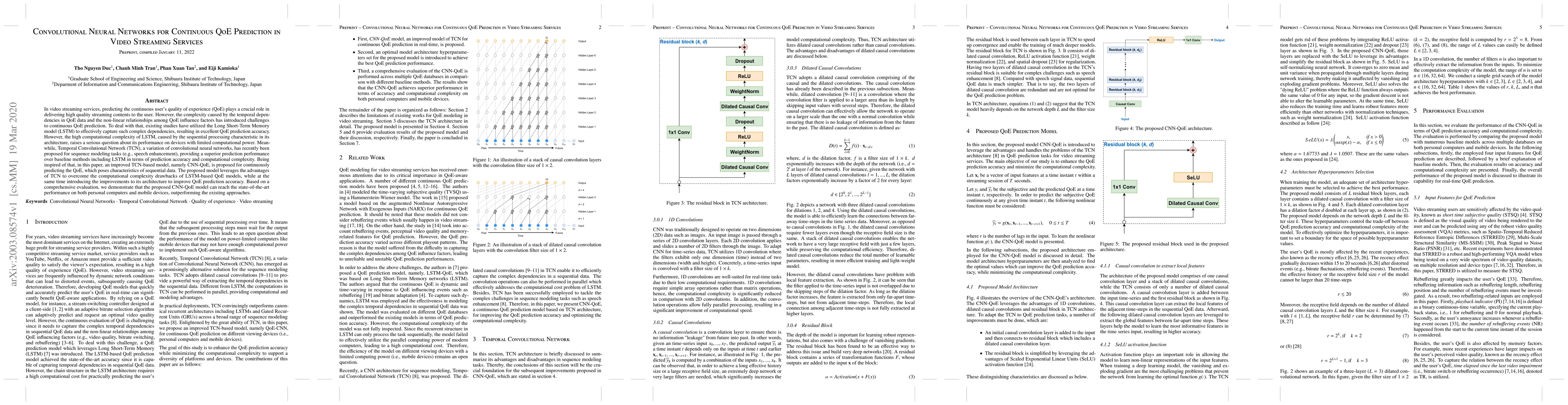 This paper proposes a Temporal Convolutional Network (TCN)-based model, CNN-QoE, for continuous prediction of Quality of Experience (QoE) in video streaming services. The model leverages TCN's advantages to overcome the computational complexity of LSTM while enhancing prediction accuracy, achieving state-of-the-art performance on both personal computers and mobile devices.