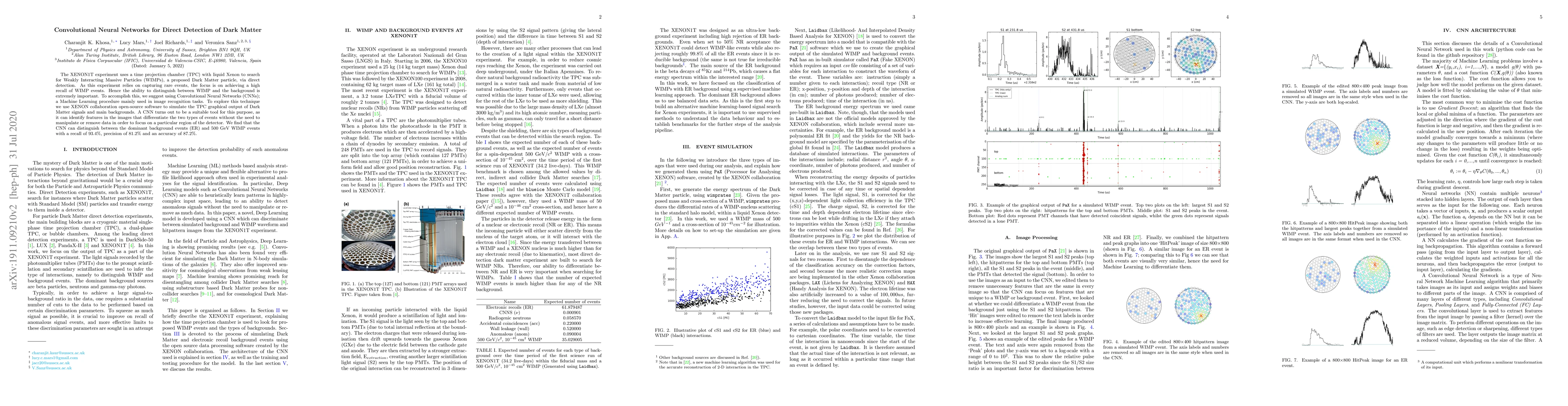 The XENON1T experiment employs Convolutional Neural Networks (CNNs) to enhance the detection of Dark Matter via distinguishing WIMP events from background noise, achieving high recall and accuracy. The CNN effectively identifies features in TPC graphical outputs that differentiate WIMP signals from background events.