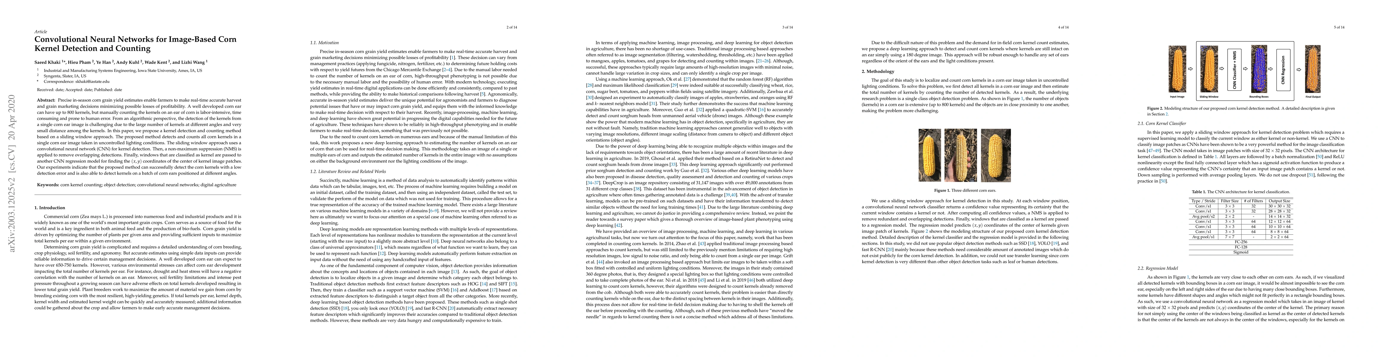 This paper proposes a convolutional neural network (CNN)-based sliding window approach for detecting and counting corn kernels in images, utilizing non-maximum suppression to reduce overlaps and regression to find kernel centers, achieving low detection error even under uncontrolled lighting conditions.