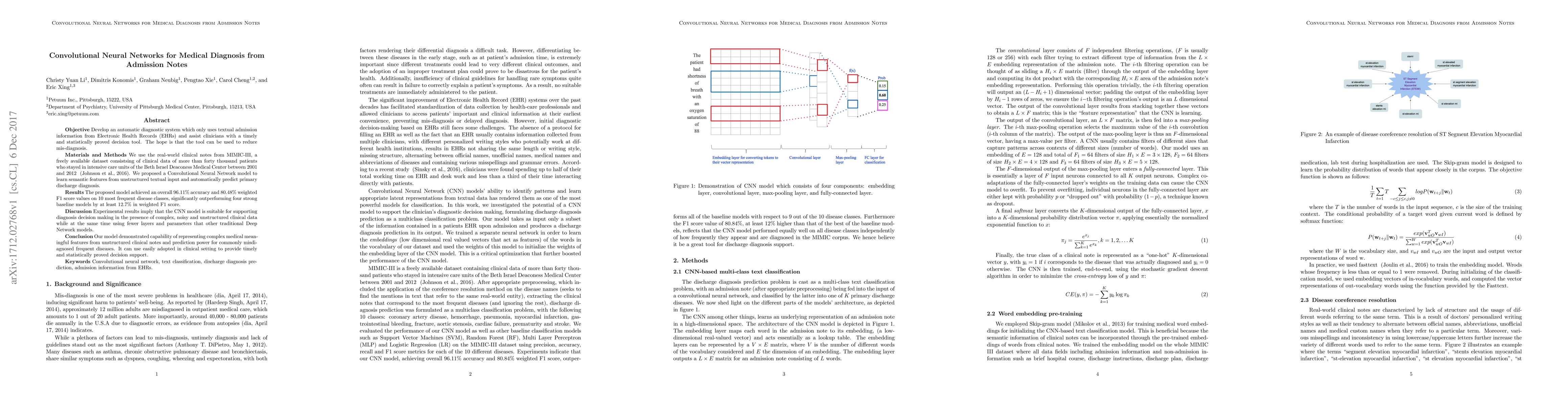 This paper develops a Convolutional Neural Network (CNN) model to automatically diagnose diseases using unstructured textual admission notes from Electronic Health Records (EHRs). The model, trained on MIMIC-III data, achieved high accuracy and outperformed baseline models, suggesting its potential to reduce misdiagnoses and provide timely decision support in clinical settings.