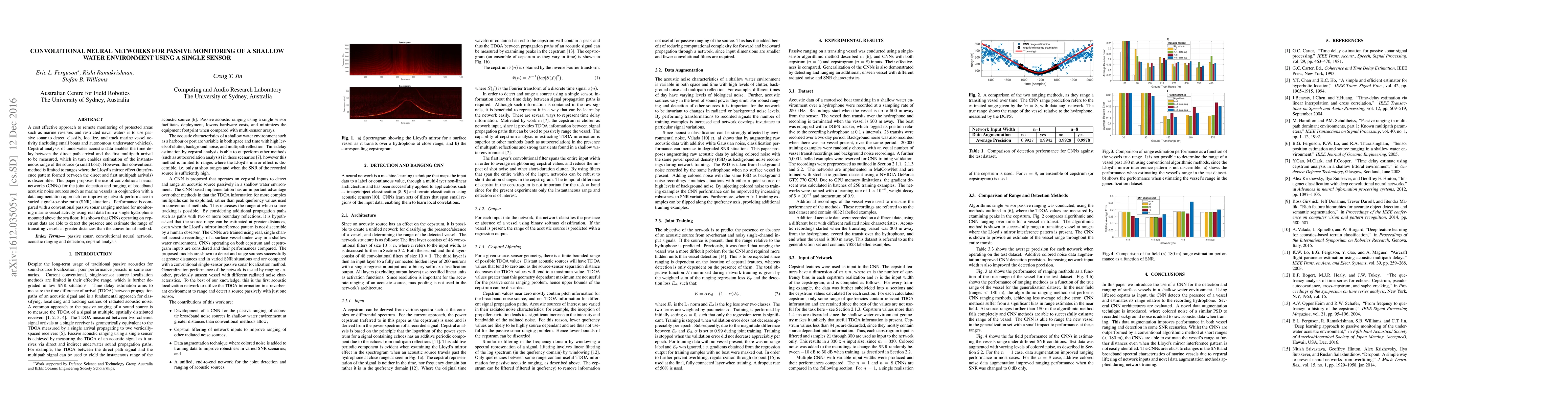 This paper proposes using convolutional neural networks (CNNs) to enhance passive sonar monitoring for marine vessel activity, achieving better detection and ranging at greater distances compared to conventional methods. The study demonstrates improved performance through a data augmentation approach in varied signal conditions.