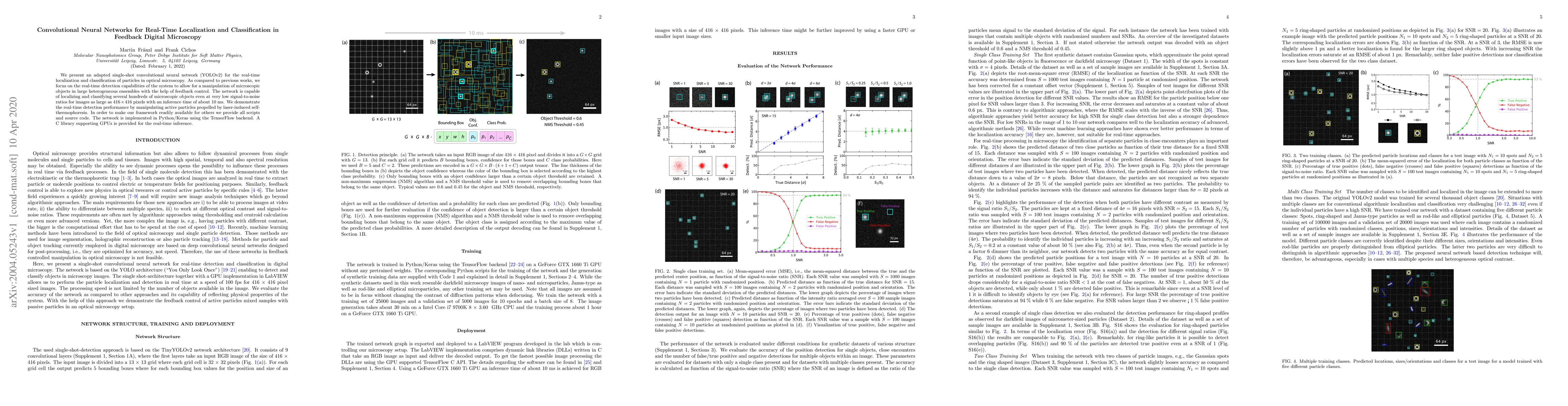 We present an adapted single-shot convolutional neural network (YOLOv2) for the real-time localization and classification of particles in optical microscopy. As compared to previous works, we focus on the real-time detection capabilities of the system to allow for manipulation of microscopic objects in large heterogeneous ensembles with the help of feedback control. The network is capable of localizing and classifying several hundreds of microscopic objects even at very low signal-to-noise ratios for images as large as 416x416 pixels with an inference time of about 10 ms. We demonstrate the real-time detection performance by manipulating active particles propelled by laser-induced self-thermophoresis. In order to make our framework readily available for others, we provide all scripts and source code. The network is implemented in Python/Keras using the TensorFlow backend. A C library supporting GPUs is provided for the real-time inference.