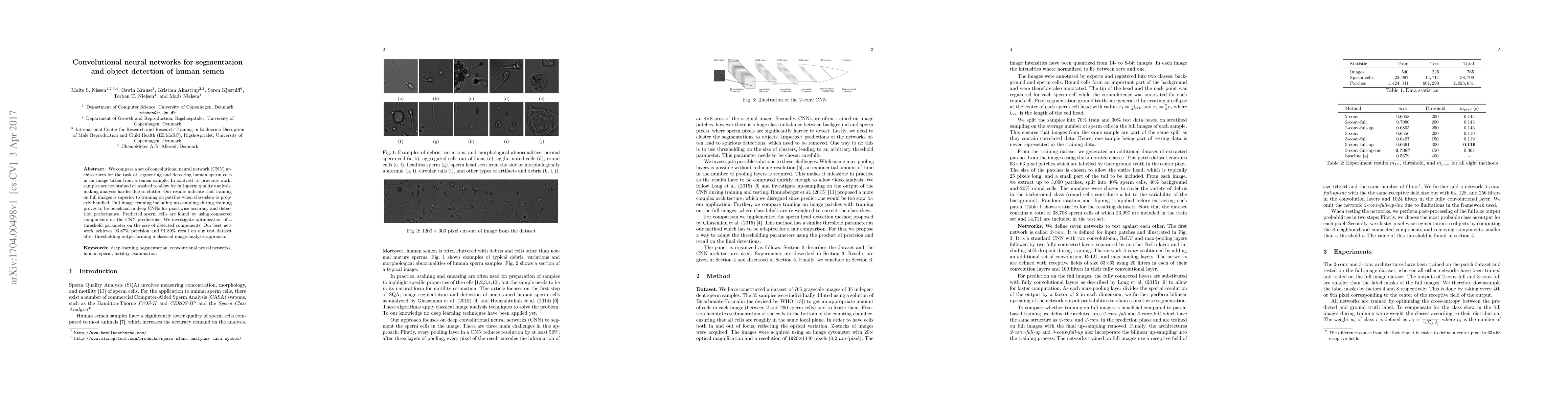 We compare a set of convolutional neural network (CNN) architectures for the task of segmenting and detecting human sperm cells in an image taken from a semen sample. In contrast to previous work, samples are not stained or washed to allow for full sperm quality analysis, making analysis harder due to clutter. Our results indicate that training on full images is superior to training on patches when class-skew is properly handled. Full image training including up-sampling during training proves to be beneficial in deep CNNs for pixel wise accuracy and detection performance. Predicted sperm cells are found by using connected components on the CNN predictions. We investigate optimization of a threshold parameter on the size of detected components. Our best network achieves 93.87% precision and 91.89% recall on our test dataset after thresholding outperforming a classical mage analysis approach.