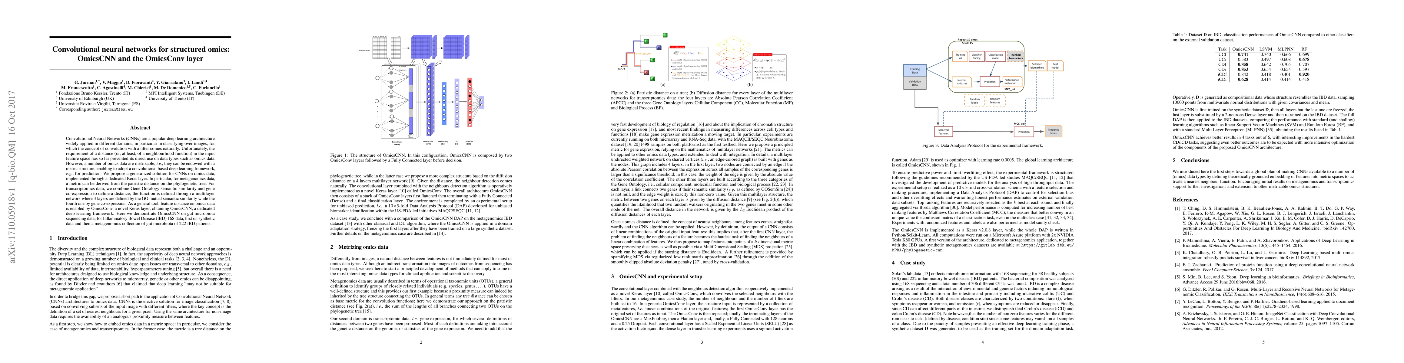 This paper proposes OmicsCNN, a convolutional neural network framework for analyzing structured omics data, utilizing a specialized OmicsConv layer that defines a metric distance for non-image data types. The framework is demonstrated on gut microbiota sequencing data for Inflammatory Bowel Disease, showing its effectiveness on both synthetic and real patient data.
