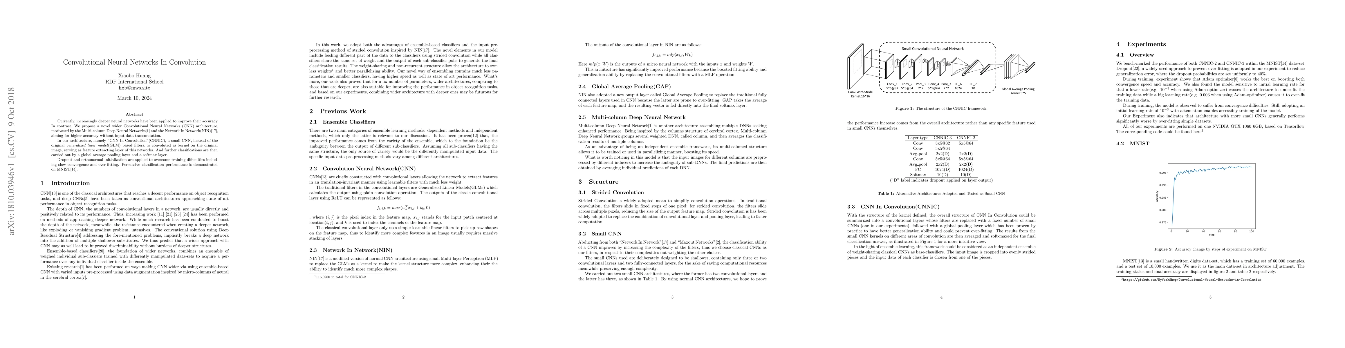 This paper introduces a novel wider Convolutional Neural Network (CNN) architecture called "CNN In Convolution" (CNNIC), which uses a small CNN as a kernel to extract features directly from the original image, aiming for higher accuracy without data transformation. The proposed method includes dropout and orthonormal initialization to address training challenges, and it demonstrates strong classification performance on MNIST.