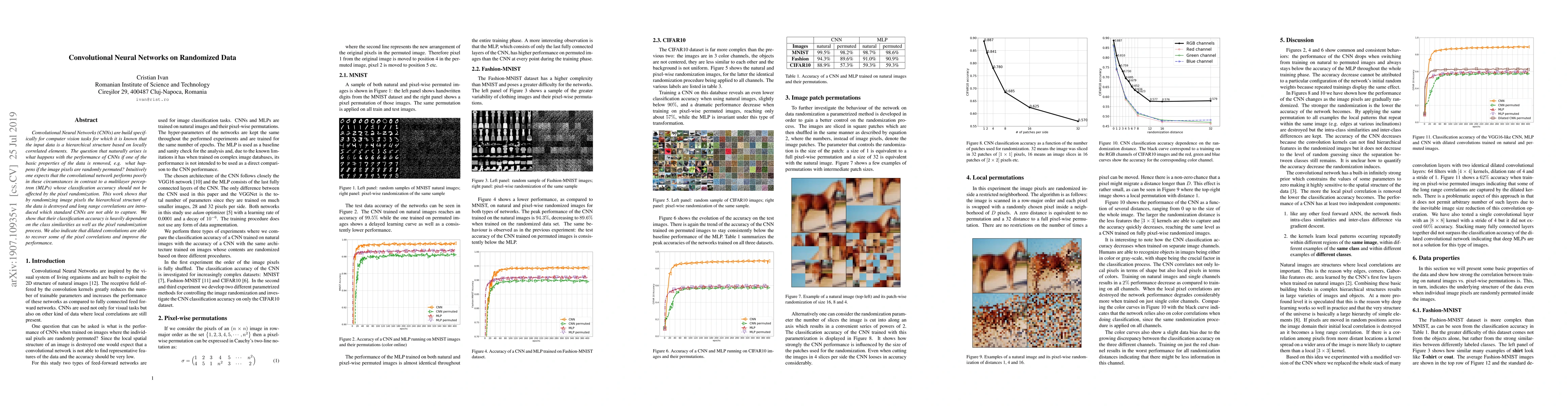 Convolutional Neural Networks (CNNs) are build specifically for computer vision tasks for which it is known that the input data is a hierarchical structure based on locally correlated elements. The question that naturally arises is what happens with the performance of CNNs if one of the basic properties of the data is removed, e.g. what happens if the image pixels are randomly permuted? Intuitively one expects that the convolutional network performs poorly in these circumstances in contrast to a multilayer perceptron (MLPs) whose classification accuracy should not be affected by the pixel randomization. This work shows that by randomizing image pixels the hierarchical structure of the data is destroyed and long range correlations are introduced which standard CNNs are not able to capture. We show that their classification accuracy is heavily dependent on the class similarities as well as the pixel randomization process. We also indicate that dilated convolutions are able to recover some of the pixel correlations and improve the performance.