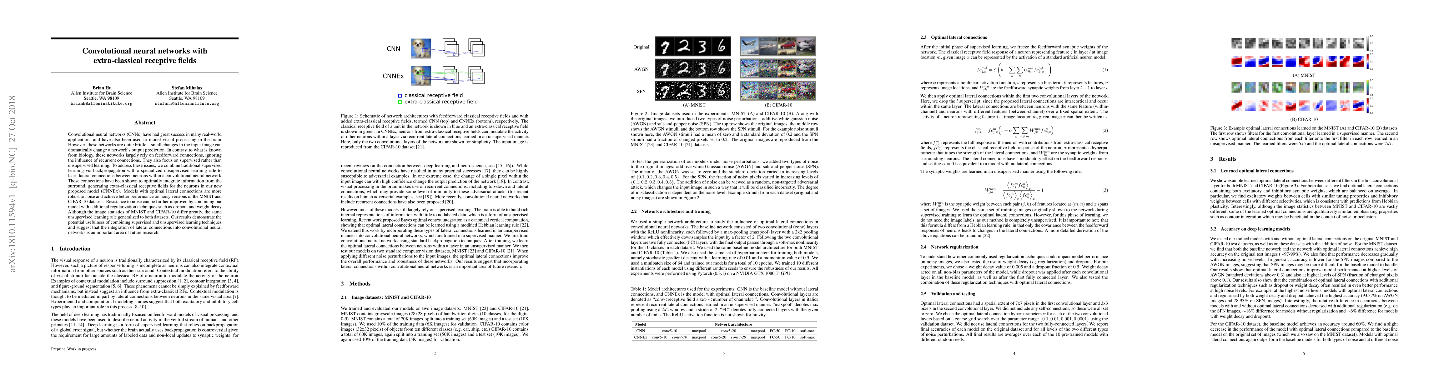 This paper proposes CNNEx, a convolutional neural network that incorporates lateral connections learned via an unsupervised learning rule to create extra-classical receptive fields, enhancing robustness and performance on noisy datasets. The model's success on MNIST and CIFAR-10 suggests that integrating lateral connections and combining supervised and unsupervised learning can improve neural network robustness.