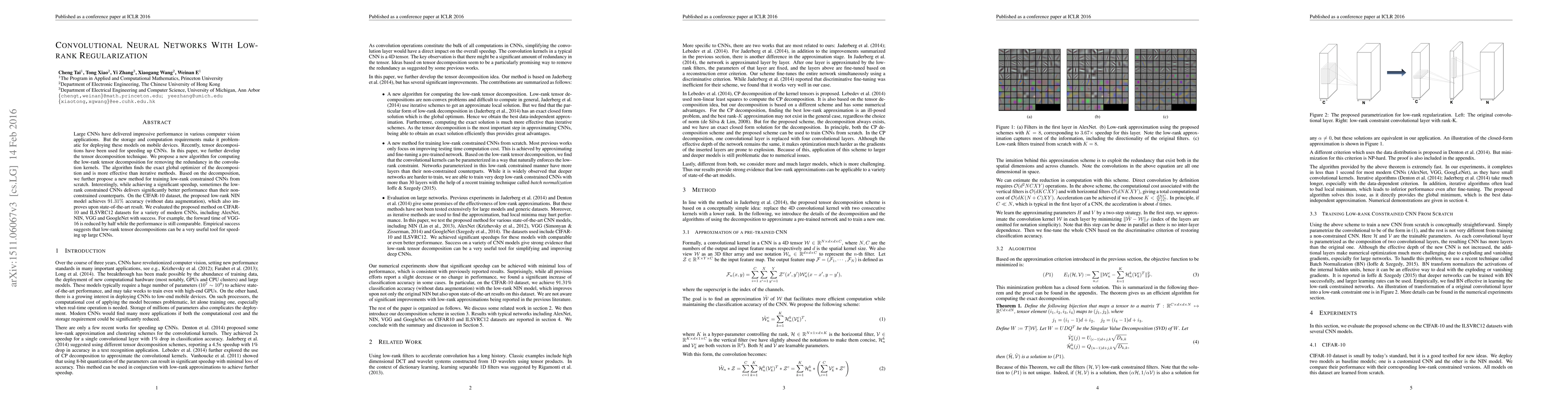 Large CNNs have delivered impressive performance in various computer vision applications. But the storage and computation requirements make it problematic for deploying these models on mobile devices. Recently, tensor decompositions have been used for speeding up CNNs. In this paper, we further develop the tensor decomposition technique. We propose a new algorithm for computing the low-rank tensor decomposition for removing the redundancy in the convolution kernels. The algorithm finds the exact global optimizer of the decomposition and is more effective than iterative methods. Based on the decomposition, we further propose a new method for training low-rank constrained CNNs from scratch. Interestingly, while achieving a significant speedup, sometimes the low-rank constrained CNNs delivers significantly better performance than their non-constrained counterparts. On the CIFAR-10 dataset, the proposed low-rank NIN model achieves $91.31\%$ accuracy (without data augmentation), which also improves upon state-of-the-art result. We evaluated the proposed method on CIFAR-10 and ILSVRC12 datasets for a variety of modern CNNs, including AlexNet, NIN, VGG and GoogleNet with success. For example, the forward time of VGG-16 is reduced by half while the performance is still comparable. Empirical success suggests that low-rank tensor decompositions can be a very useful tool for speeding up large CNNs.