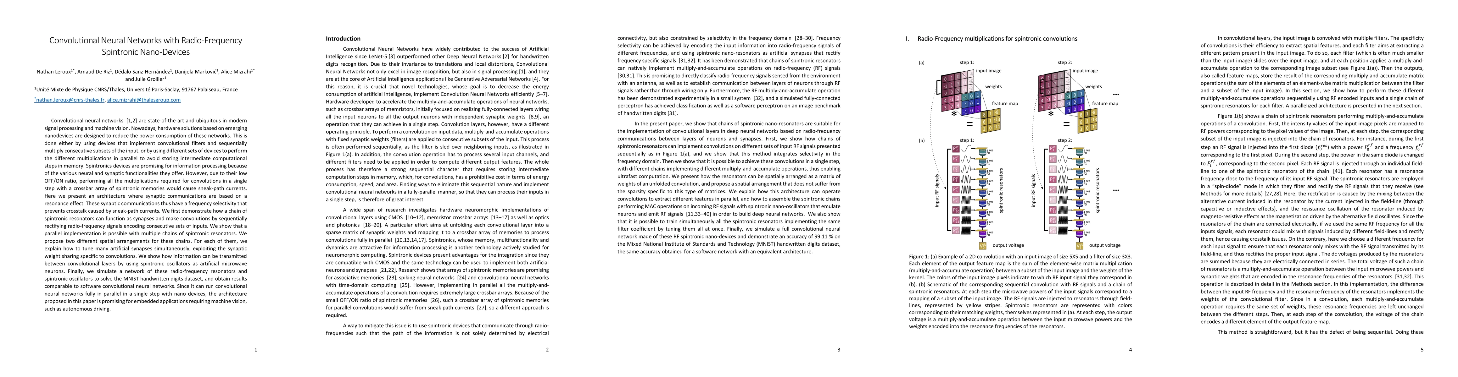 This paper proposes an architecture for convolutional neural networks using spintronic nano-devices to reduce power consumption. It introduces a method to sequentially rectify radio-frequency signals to perform convolutions, avoiding sneak-path currents, and demonstrates parallel implementation with spintronic resonators to achieve efficient computation for machine vision tasks.