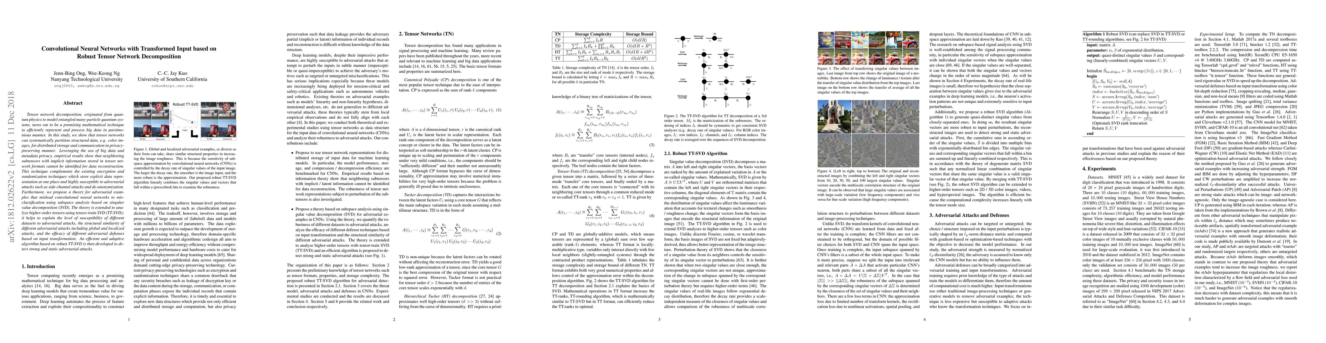 Tensor network decomposition, originated from quantum physics to model entangled many-particle quantum systems, turns out to be a promising mathematical technique to efficiently represent and process big data in parsimonious manner. In this study, we show that tensor networks can systematically partition structured data, e.g. color images, for distributed storage and communication in privacy-preserving manner. Leveraging the sea of big data and metadata privacy, empirical results show that neighbouring subtensors with implicit information stored in tensor network formats cannot be identified for data reconstruction. This technique complements the existing encryption and randomization techniques which store explicit data representation at one place and highly susceptible to adversarial attacks such as side-channel attacks and de-anonymization. Furthermore, we propose a theory for adversarial examples that mislead convolutional neural networks to misclassification using subspace analysis based on singular value decomposition (SVD). The theory is extended to analyze higher-order tensors using tensor-train SVD (TT-SVD); it helps to explain the level of susceptibility of different datasets to adversarial attacks, the structural similarity of different adversarial attacks including global and localized attacks, and the efficacy of different adversarial defenses based on input transformation. An efficient and adaptive algorithm based on robust TT-SVD is then developed to detect strong and static adversarial attacks.