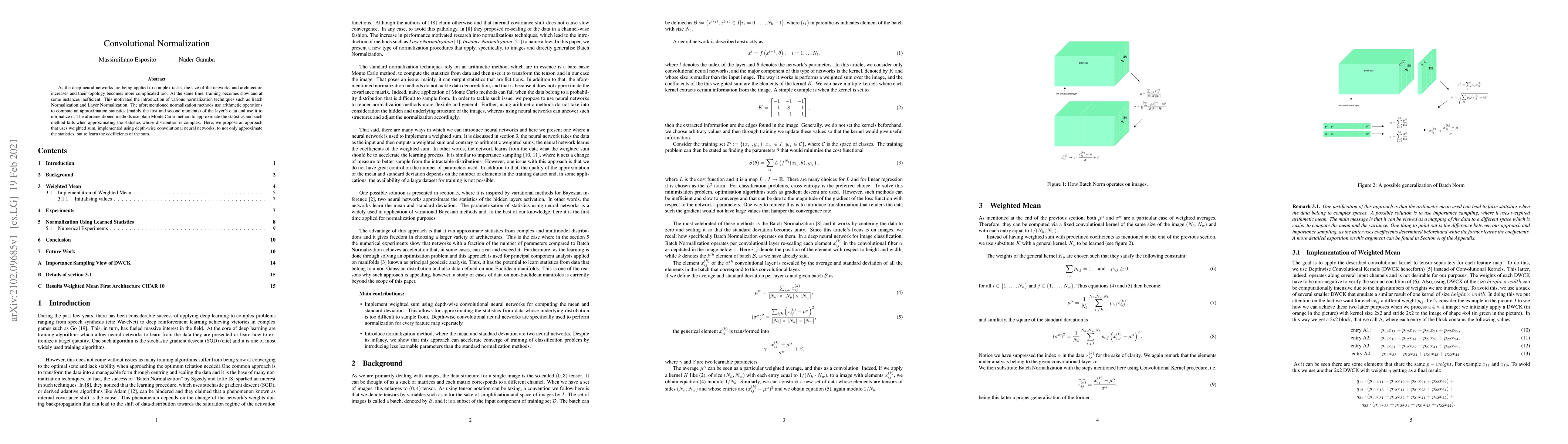 Two-Line Summary: This paper proposes a novel convolutional normalization technique that leverages depth-wise convolutional neural networks to approximate complex layer statistics more accurately than traditional methods like Batch Normalization, by learning the coefficients of a weighted sum instead of using plain Monte Carlo approximation. The approach aims to enhance the efficiency and speed of training deep neural networks for complex tasks.
