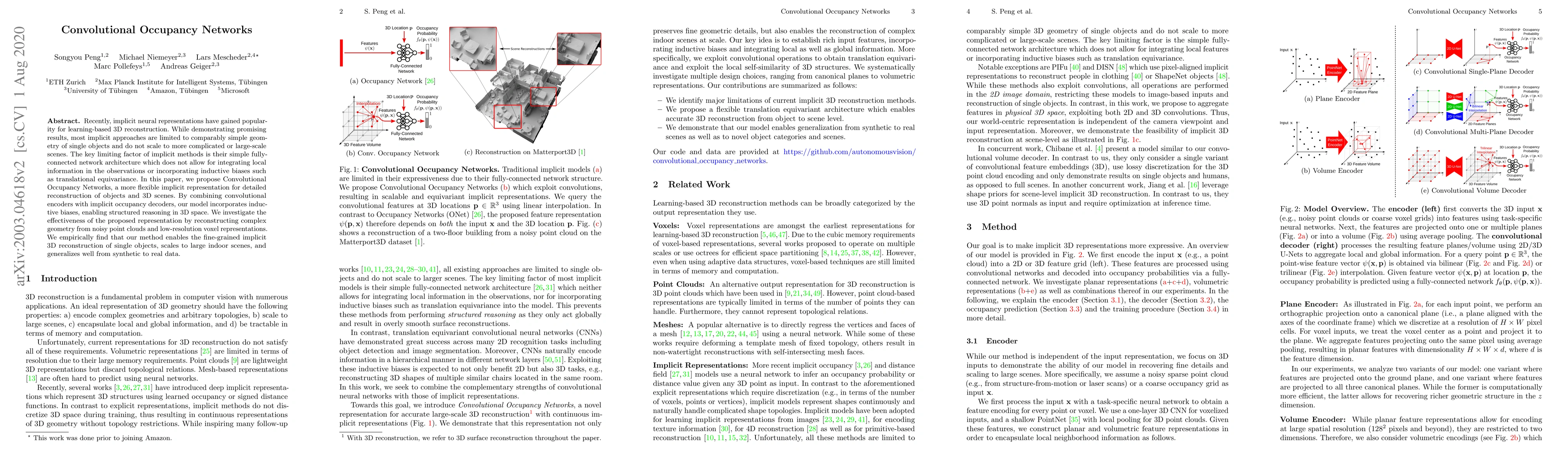 Recently, implicit neural representations have gained popularity for learning-based 3D reconstruction. While demonstrating promising results, most implicit approaches are limited to comparably simple geometry of single objects and do not scale to more complicated or large-scale scenes. The key limiting factor of implicit methods is their simple fully-connected network architecture which does not allow for integrating local information in the observations or incorporating inductive biases such as translational equivariance. In this paper, we propose Convolutional Occupancy Networks, a more flexible implicit representation for detailed reconstruction of objects and 3D scenes. By combining convolutional encoders with implicit occupancy decoders, our model incorporates inductive biases, enabling structured reasoning in 3D space. We investigate the effectiveness of the proposed representation by reconstructing complex geometry from noisy point clouds and low-resolution voxel representations. We empirically find that our method enables the fine-grained implicit 3D reconstruction of single objects, scales to large indoor scenes, and generalizes well from synthetic to real data.