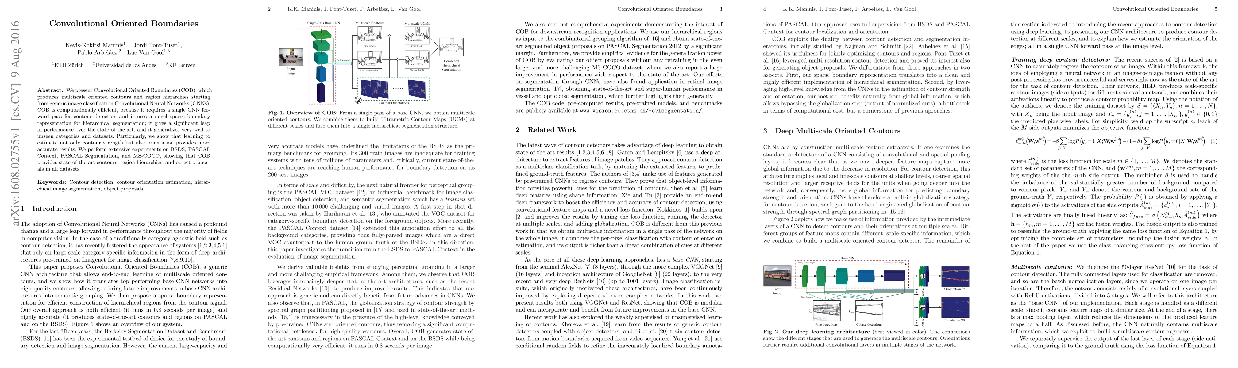 We present Convolutional Oriented Boundaries (COB), which produces multiscale oriented contours and region hierarchies starting from generic image classification Convolutional Neural Networks (CNNs). COB is computationally efficient, because it requires a single CNN forward pass for contour detection and it uses a novel sparse boundary representation for hierarchical segmentation; it gives a significant leap in performance over the state-of-the-art, and it generalizes very well to unseen categories and datasets. Particularly, we show that learning to estimate not only contour strength but also orientation provides more accurate results. We perform extensive experiments on BSDS, PASCAL Context, PASCAL Segmentation, and MS-COCO, showing that COB provides state-of-the-art contours, region hierarchies, and object proposals in all datasets.