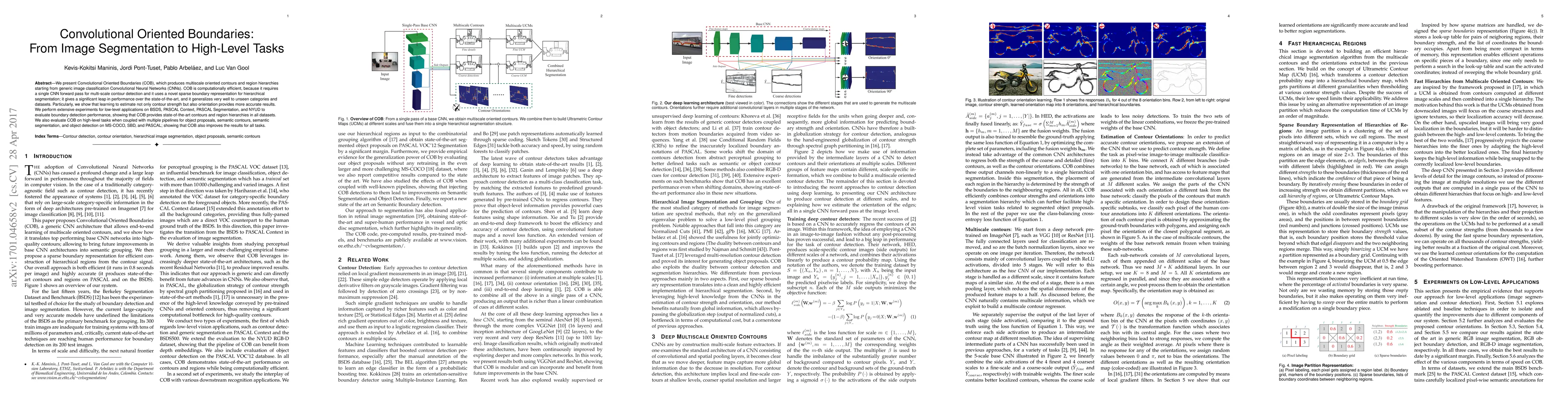 A new method called Convolutional Oriented Boundaries (COB) improves image segmentation and high-level tasks by detecting multiscale oriented contours and region hierarchies from generic image classification CNNs.