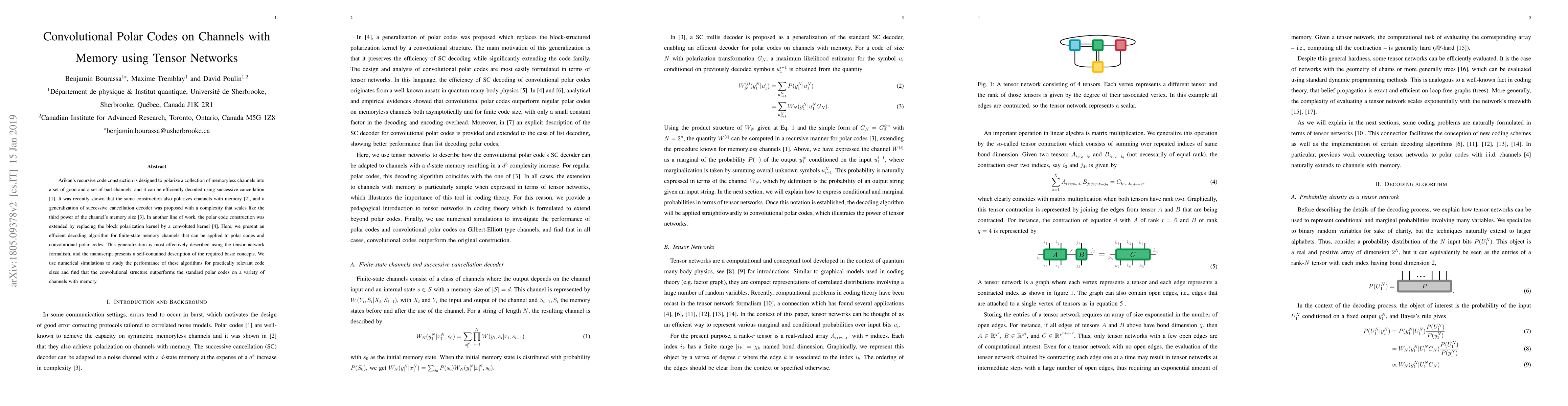 The paper presents an efficient decoding algorithm for finite-state memory channels using tensor networks, generalizing successive cancellation decoding for convolutional polar codes.