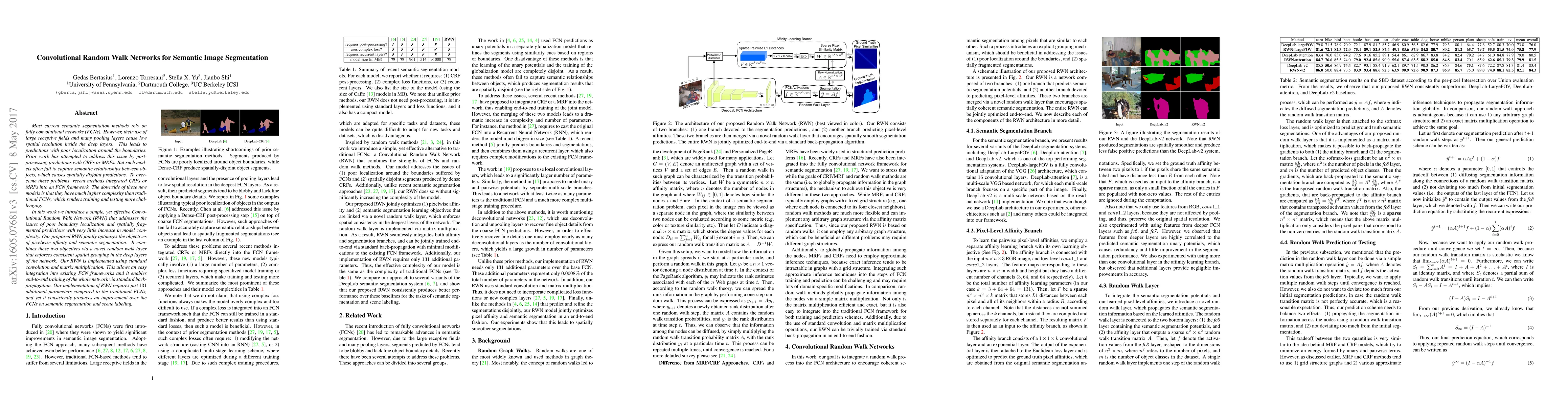Most current semantic segmentation methods rely on fully convolutional networks (FCNs). However, their use of large receptive fields and many pooling layers cause low spatial resolution inside the deep layers. This leads to predictions with poor localization around the boundaries. Prior work has attempted to address this issue by post-processing predictions with CRFs or MRFs. But such models often fail to capture semantic relationships between objects, which causes spatially disjoint predictions. To overcome these problems, recent methods integrated CRFs or MRFs into an FCN framework. The downside of these new models is that they have much higher complexity than traditional FCNs, which renders training and testing more challenging. In this work we introduce a simple, yet effective Convolutional Random Walk Network (RWN) that addresses the issues of poor boundary localization and spatially fragmented predictions with very little increase in model complexity. Our proposed RWN jointly optimizes the objectives of pixelwise affinity and semantic segmentation. It combines these two objectives via a novel random walk layer that enforces consistent spatial grouping in the deep layers of the network. Our RWN is implemented using standard convolution and matrix multiplication. This allows an easy integration into existing FCN frameworks and it enables end-to-end training of the whole network via standard back-propagation. Our implementation of RWN requires just $131$ additional parameters compared to the traditional FCNs, and yet it consistently produces an improvement over the FCNs on semantic segmentation and scene labeling.