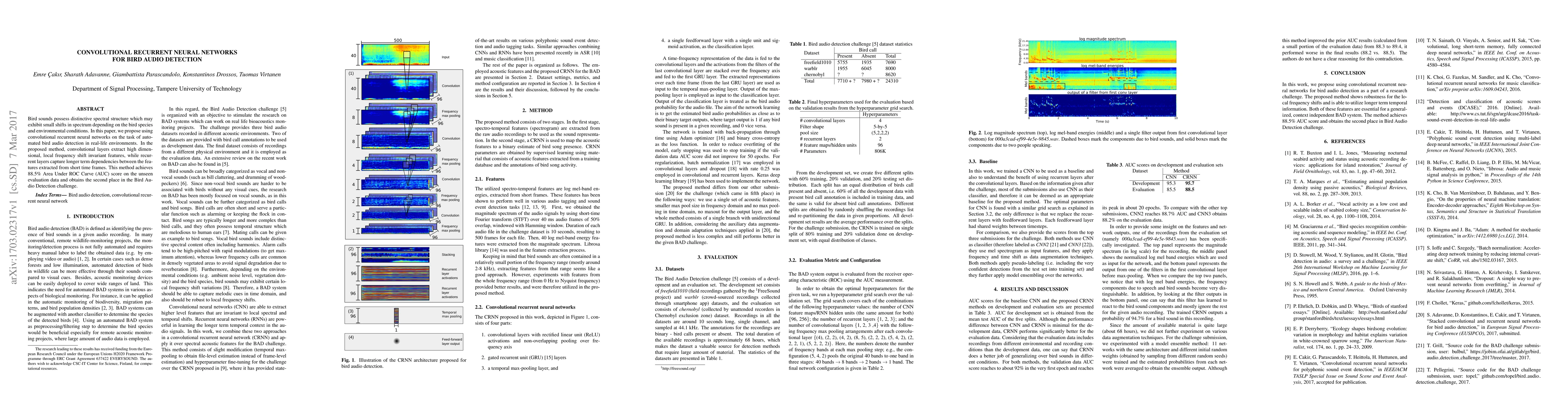 This paper proposes convolutional recurrent neural networks for automated bird audio detection, leveraging convolutional layers for feature extraction and recurrent layers for capturing temporal dependencies. The method achieves an 88.5% AUC score, securing second place in the Bird Audio Detection challenge.