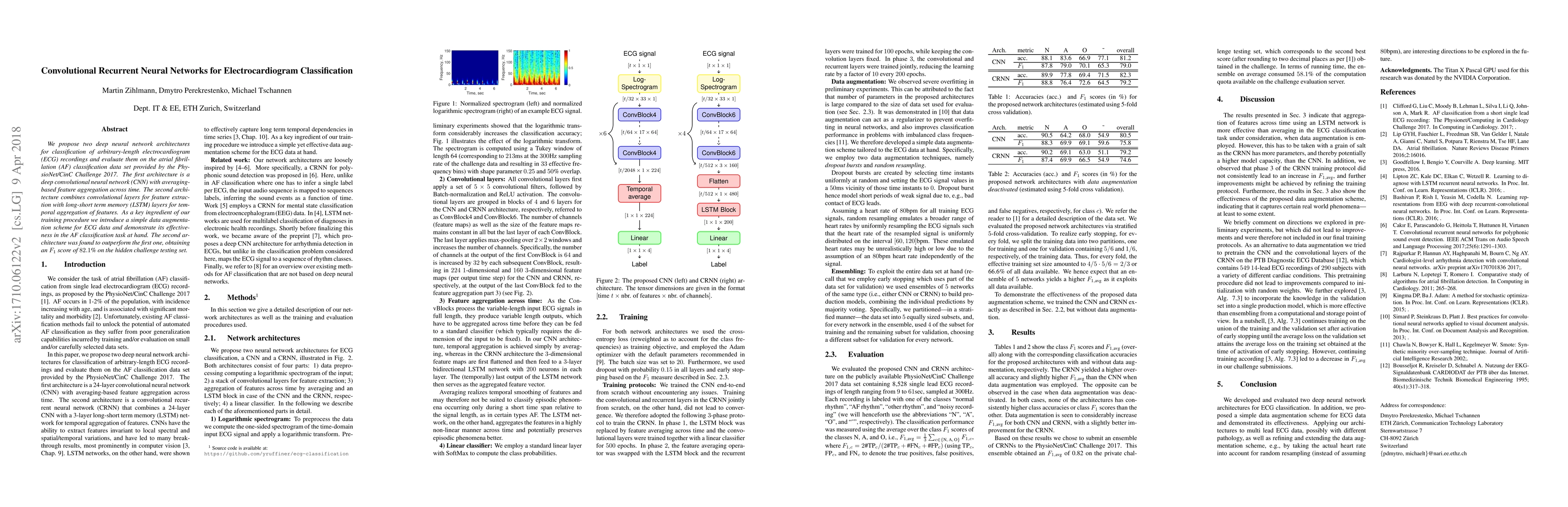 This paper proposes two deep neural network architectures for classifying electrocardiogram (ECG) recordings, specifically for atrial fibrillation detection. The second architecture, combining convolutional and LSTM layers, outperforms the first, achieving an $F_1$ score of $82.1\%$ on the PhysioNet/CinC Challenge 2017 test set.